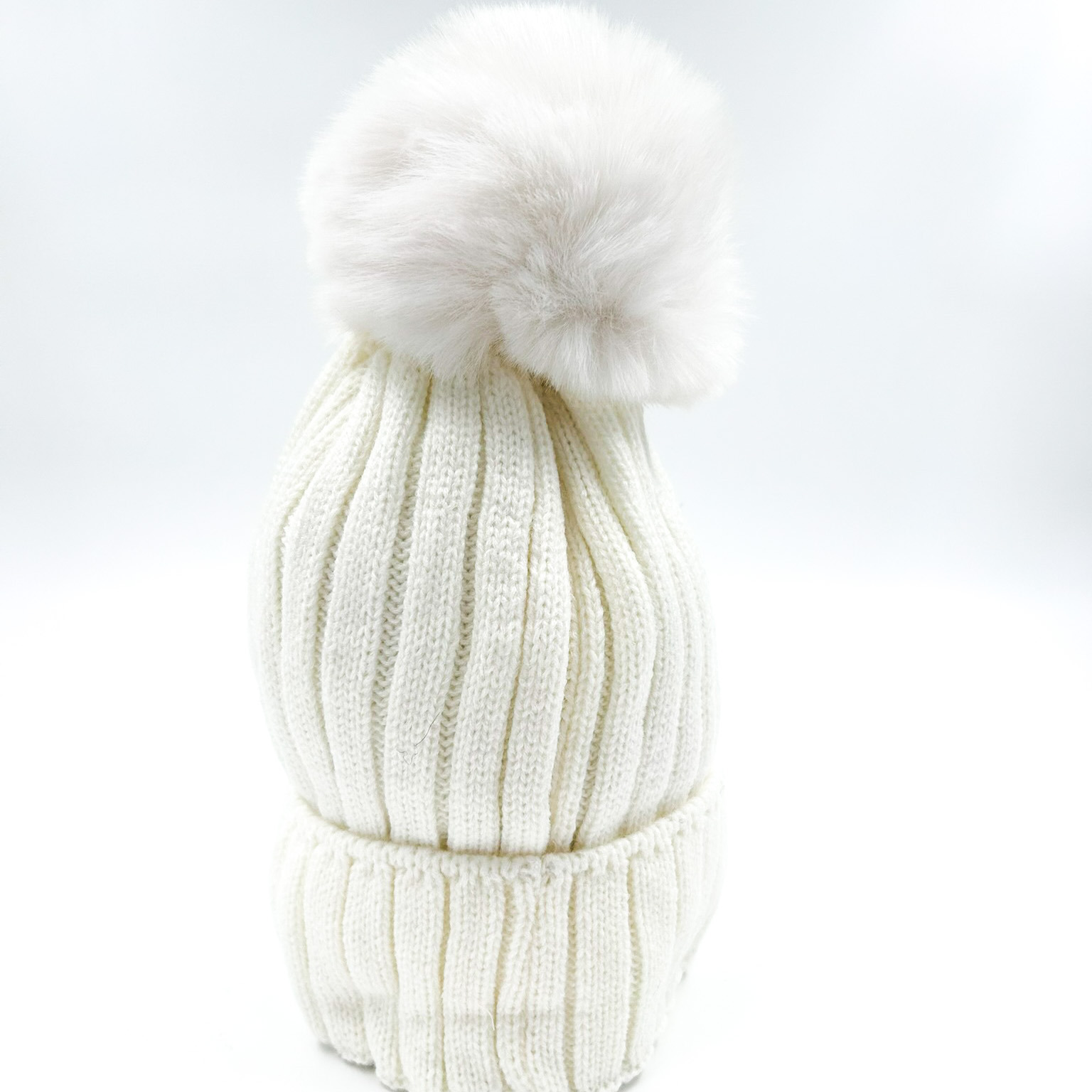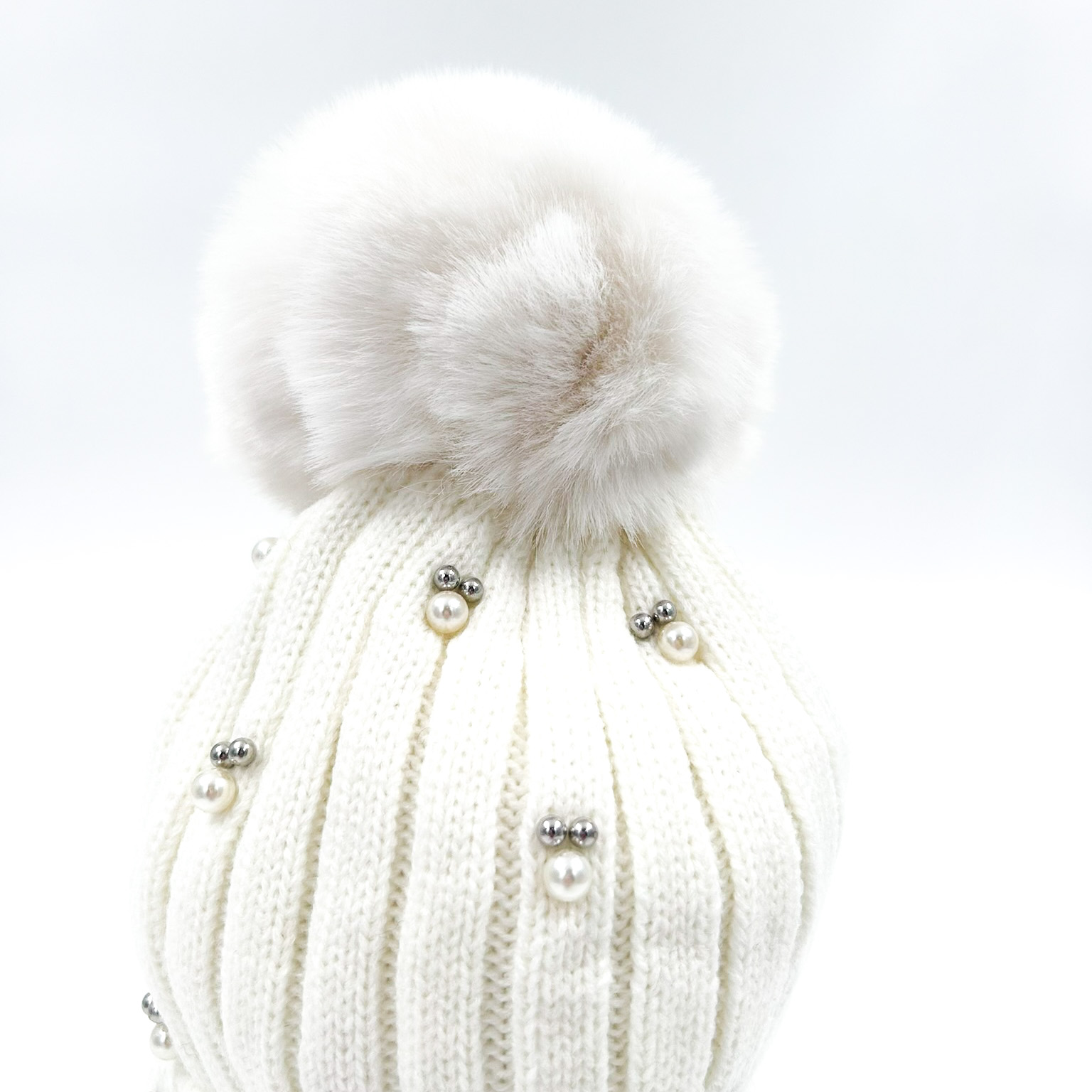 Σκουφάκι με πομ πον λευκό και διακοσμητικές πέρλες και ασημί μπιλίτσες. Διαθέτει εσωτερική επένδυση από φλις γούνα για να σας κρατάει ζεστές τον χειμώνα.