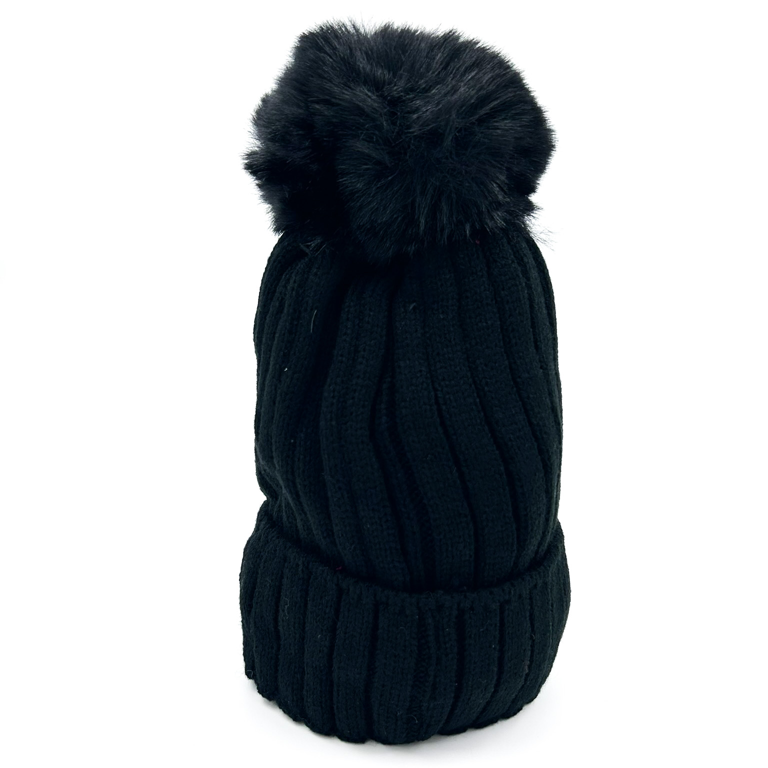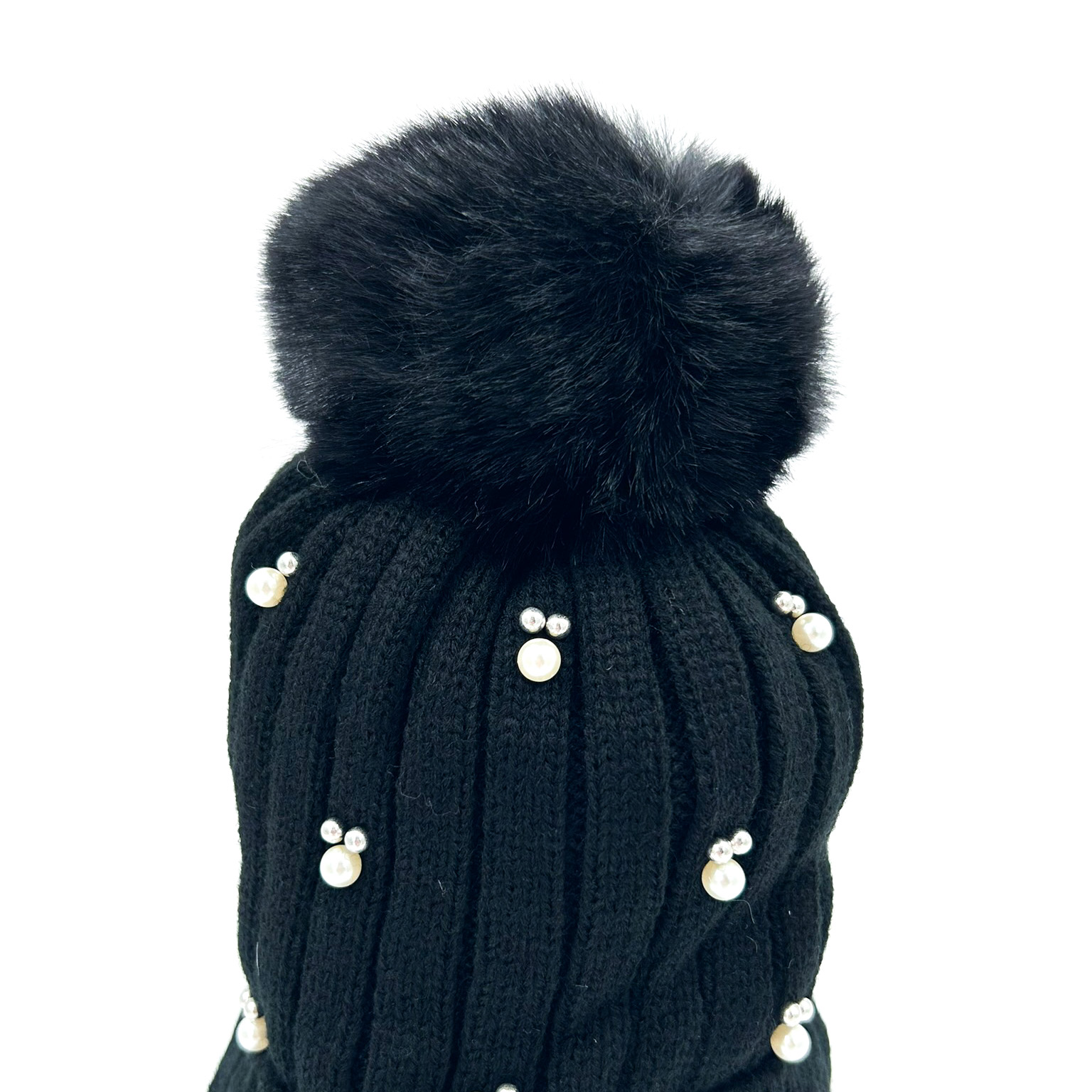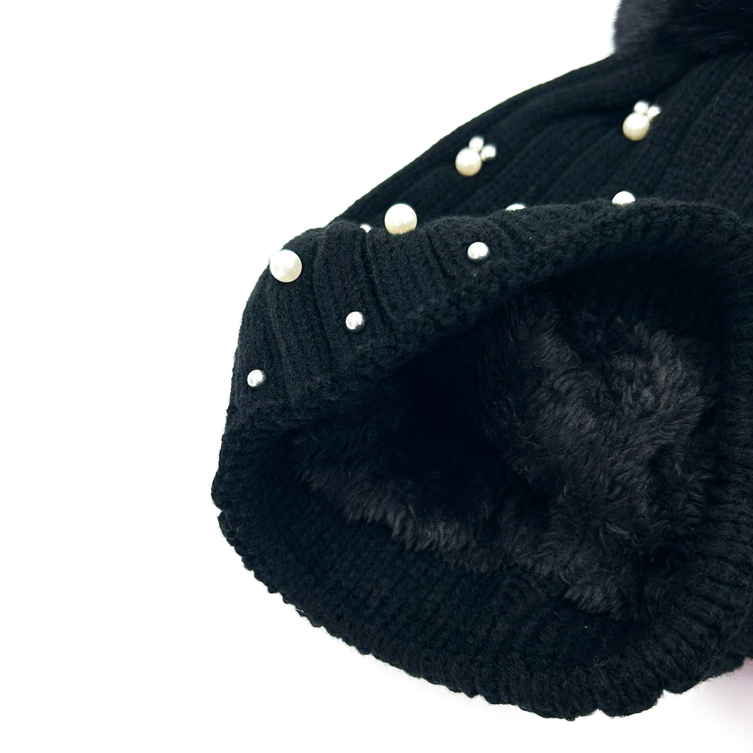 Σκουφάκι με πομ πον μαύρο και διακοσμητικές πέρλες και ασημί μπιλίτσες. Διαθέτει εσωτερική επένδυση από φλις γούνα για να σας κρατάει ζεστές τον χειμώνα.