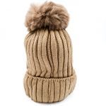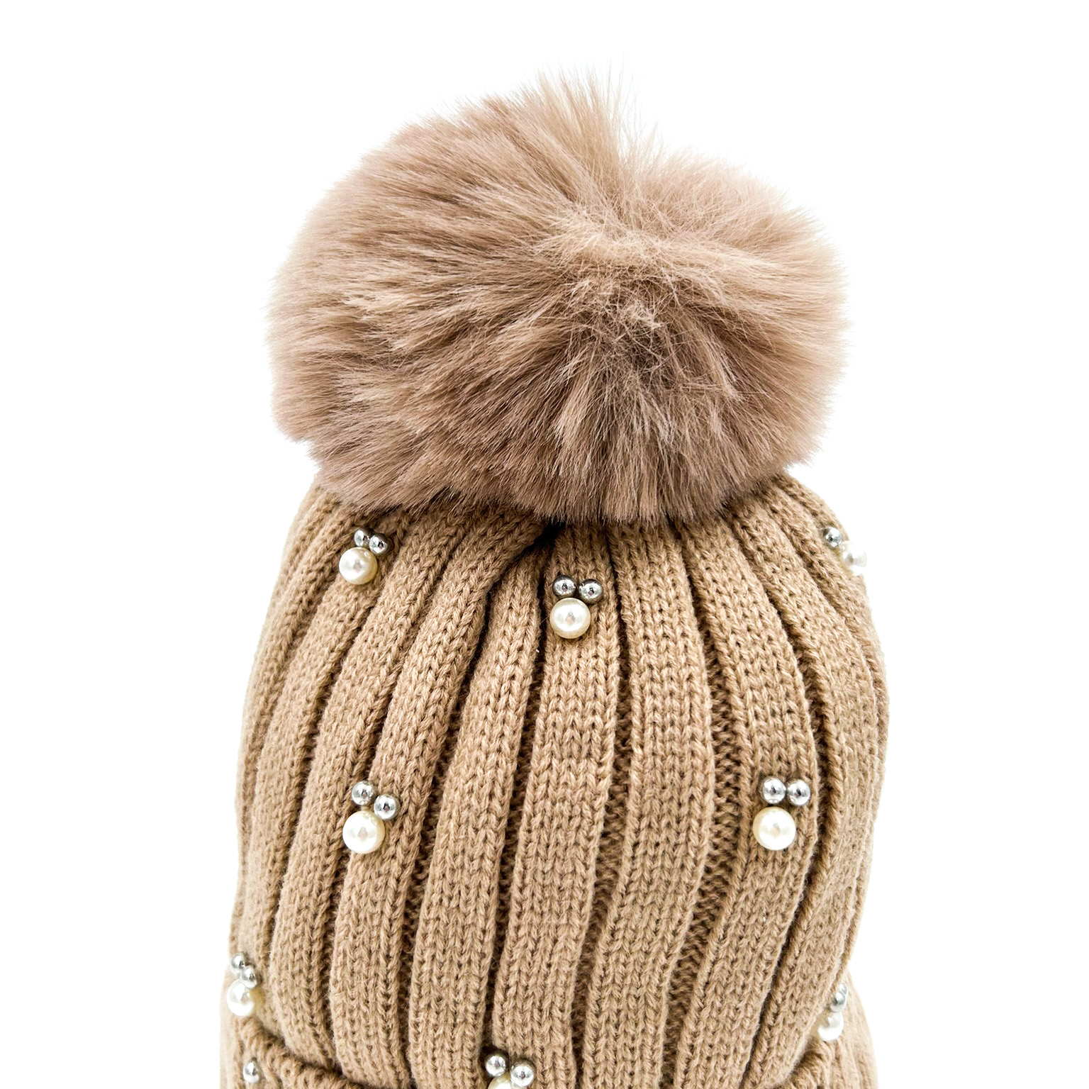 Σκουφάκι με πομ πον μπεζ και διακοσμητικές πέρλες και ασημί μπιλίτσες. Διαθέτει εσωτερική επένδυση από φλις γούνα για να σας κρατάει ζεστές τον χειμώνα.
