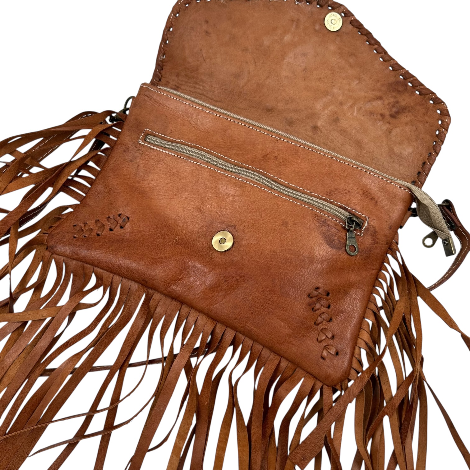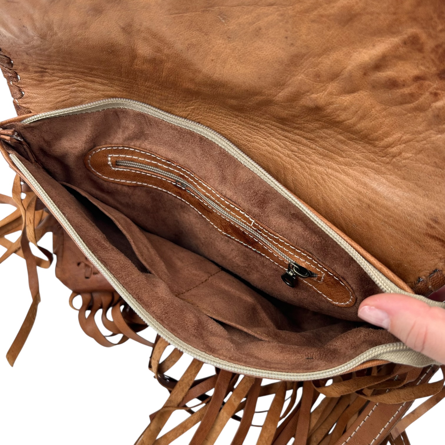 Δερμάτινη χειροποίητη τσάντα boho style με κρόσσια