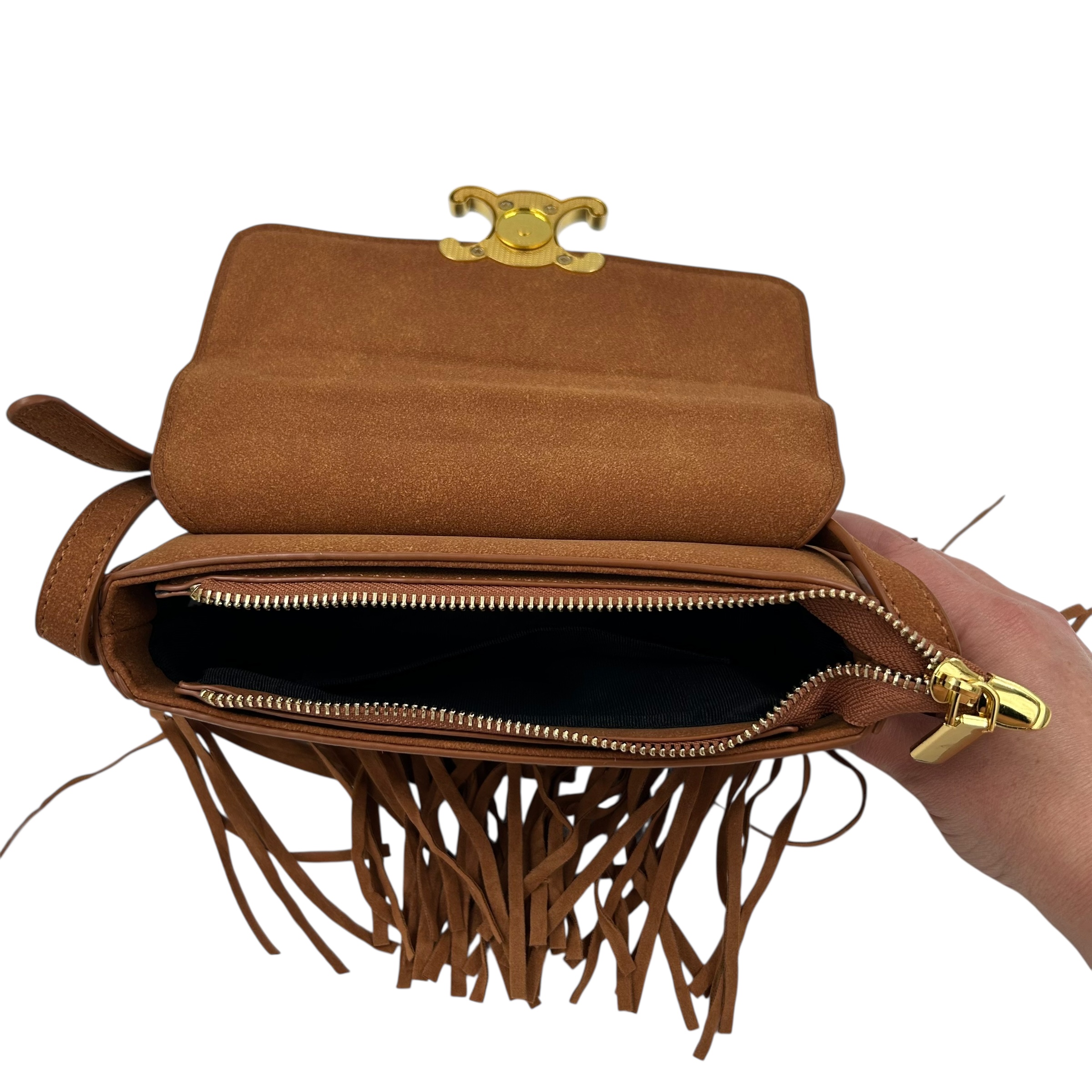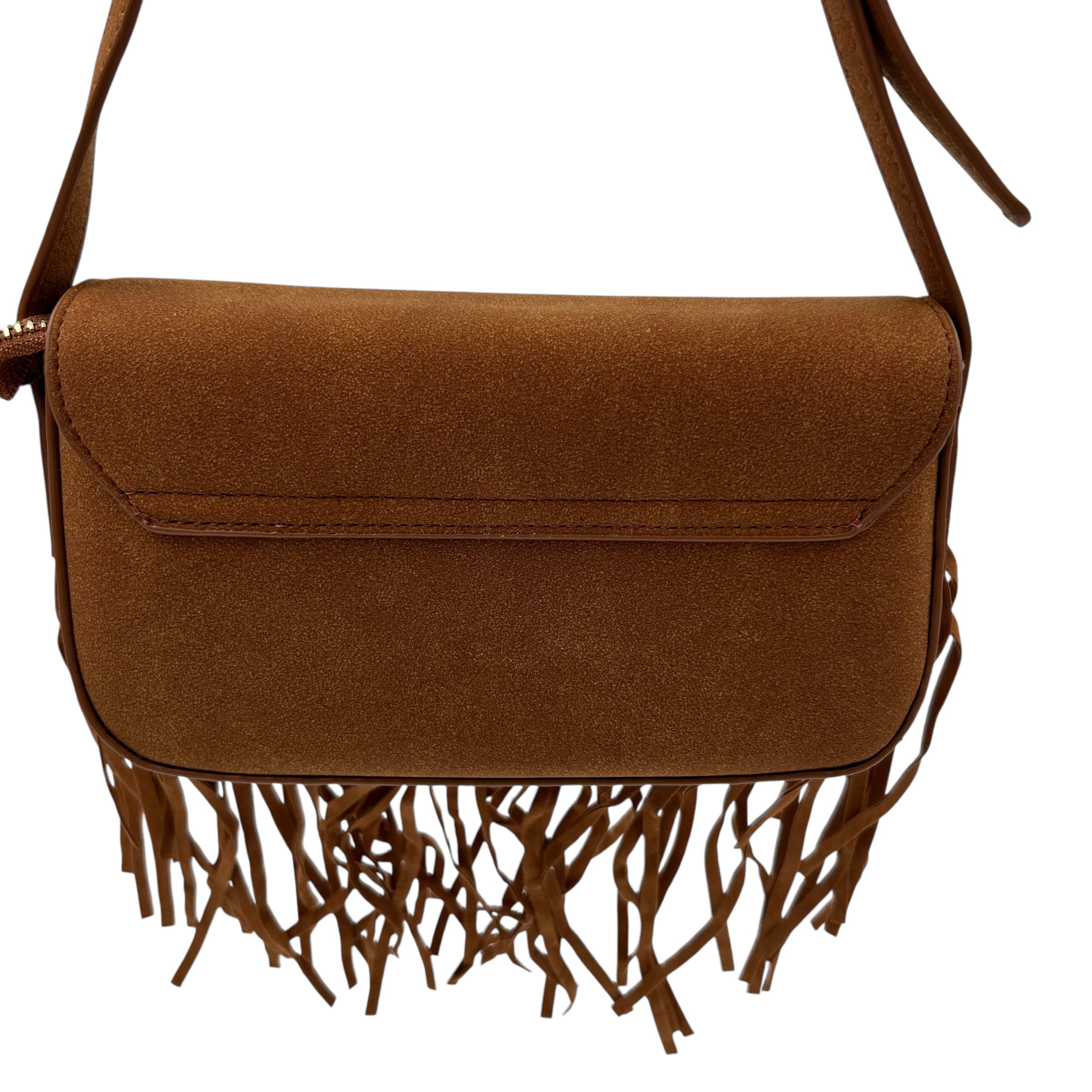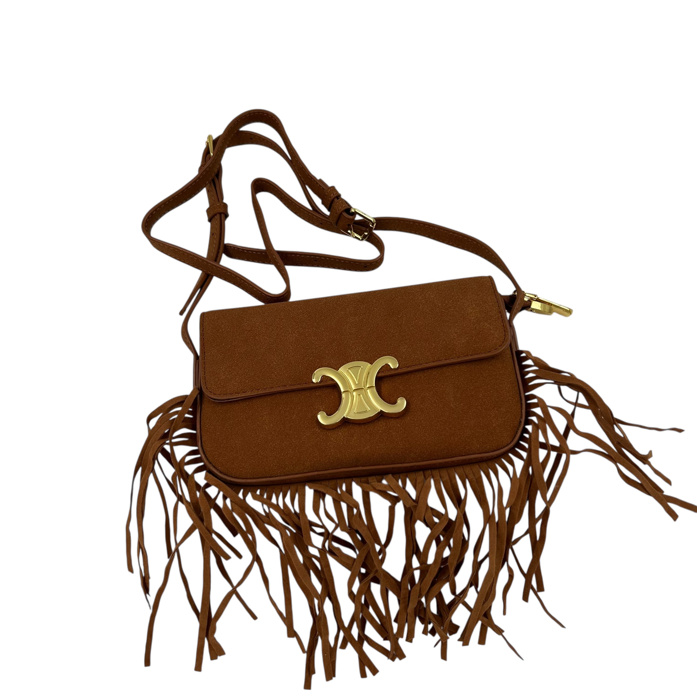 Τσαντάκι τύπου Celine καφέ σουέτ με κρόσσια
