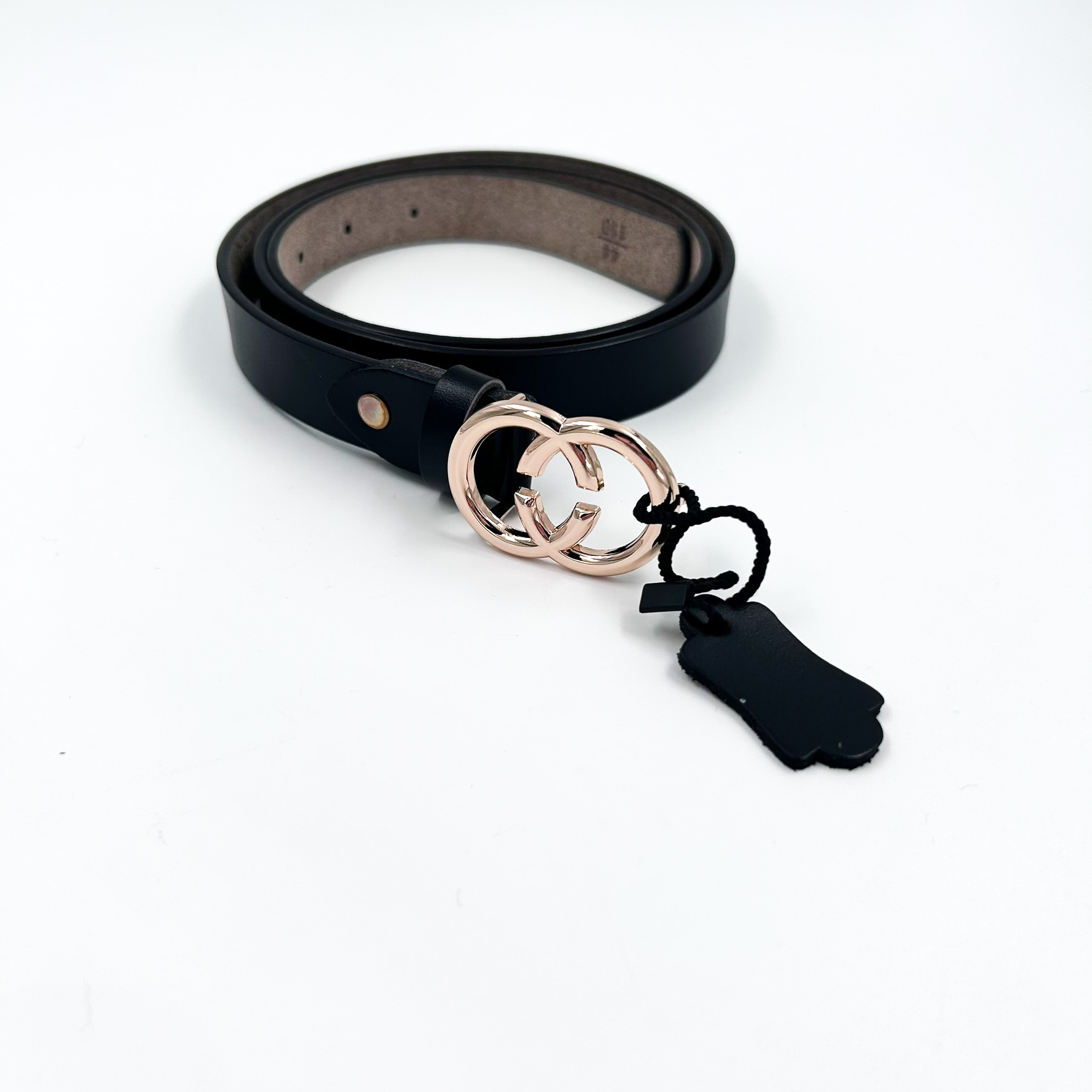 Ζώνη δερμάτινη σε μαύρο χρώμα με χρυσή αγκράφα τύπου gucci. Σύνθεση: 100% δερμάτινη. Διαστάσεις: Μήκος: 1.10 μ. Πάχος: 2 εκ.
