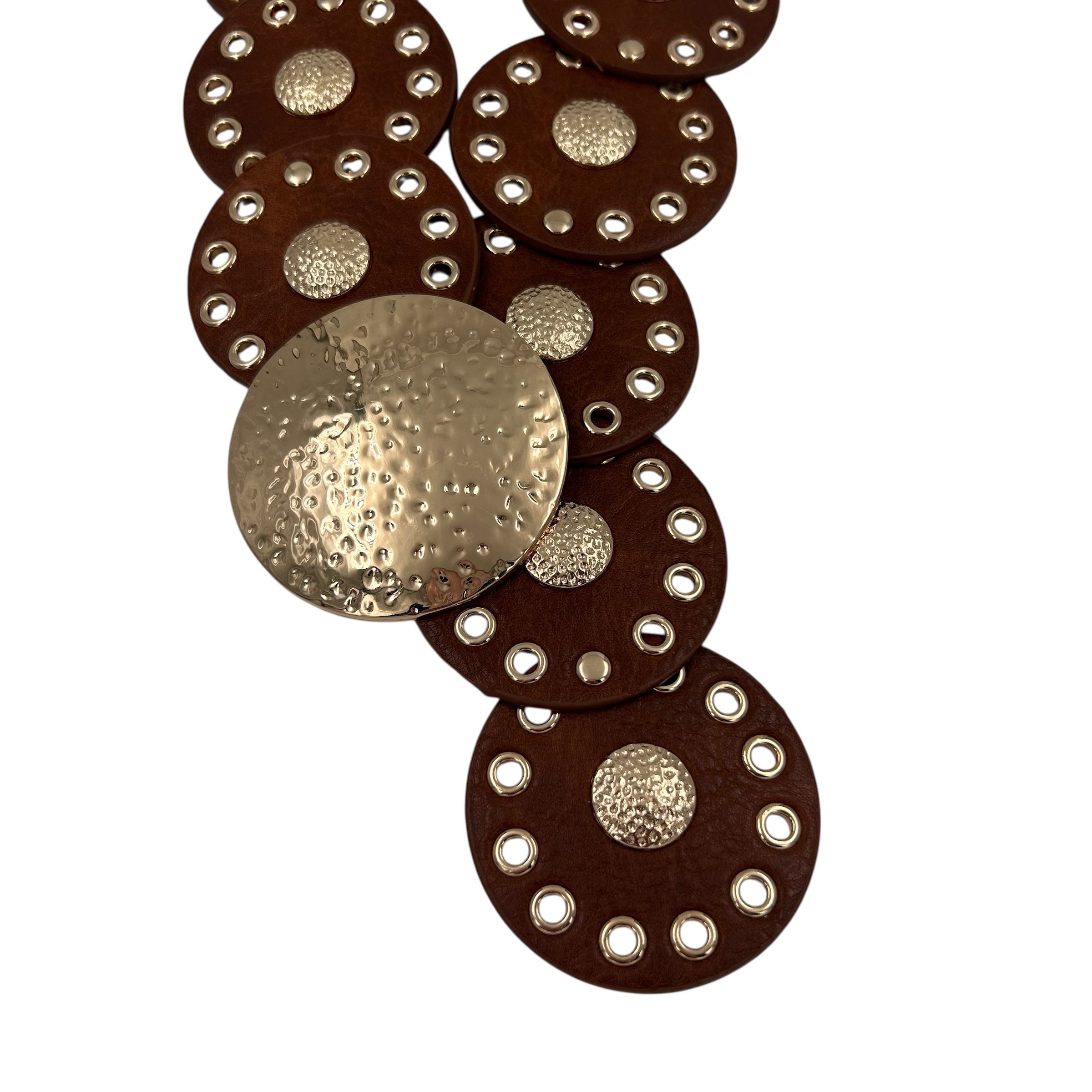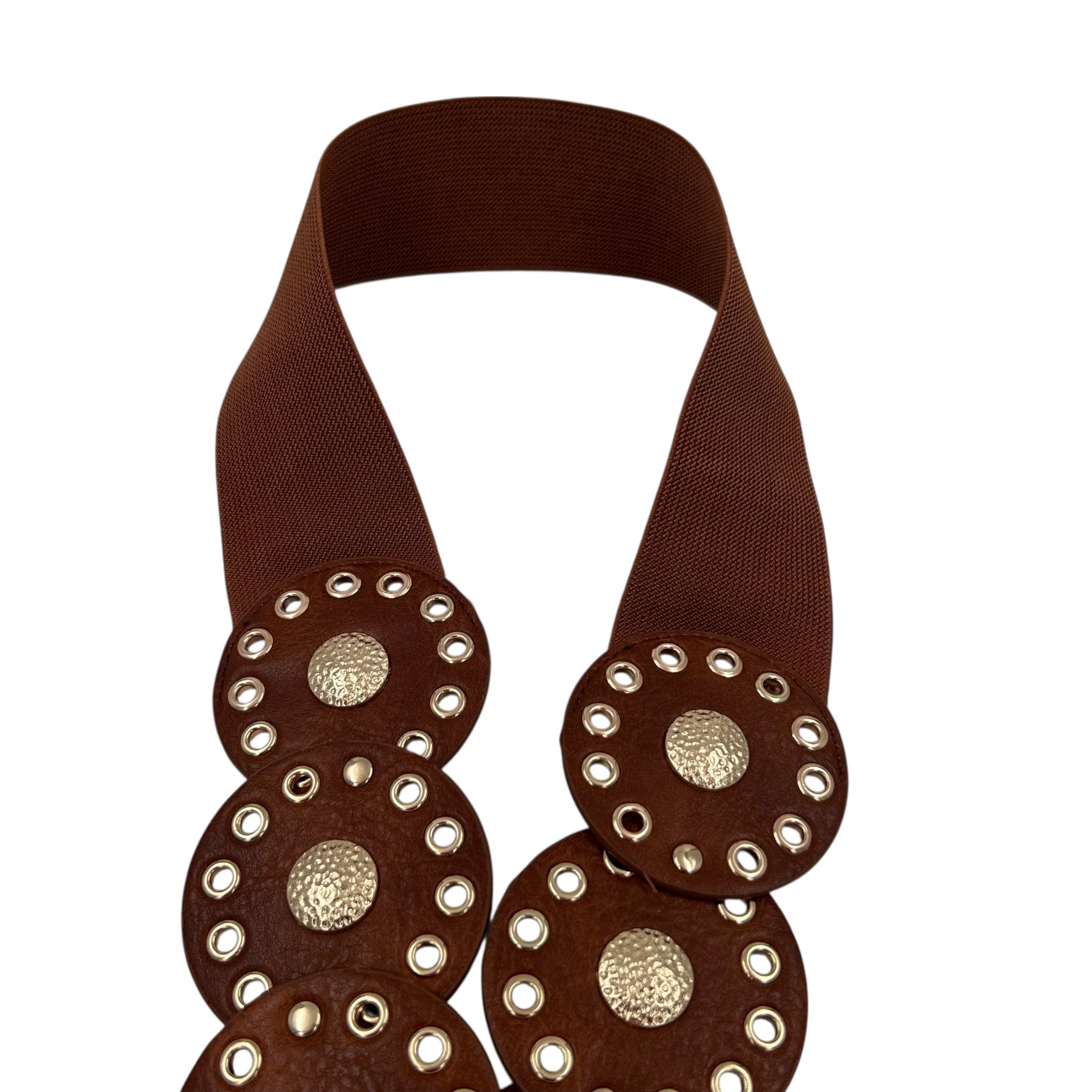 Η γυναικεία ζώνη Bohemian style σε καφέ απόχρωση είναι μεγάλη τάση για το φθινόπωρο- χειμώνα 2025 διαθέτει χρυσή κεντρική αγκράφα σε στρογγυλό σχήμα και μικρούς χρυσούς κύκλους που διακοσμούν τα δύο λουριά που την πλαισιώνουν. Στο ενδιάμεσο διαθέτει λάστιχο για μεγαλύτερη άνεση. Η ζώνη είναι χοντρή και μπορεί να φορεθεί με τα φουστάνια σας ώστε να δημιουργήσει εφέ μέσης και με τα τζιν σας. Μήκος ζώνης: 110 εκ. Πάχος: 8 εκ.