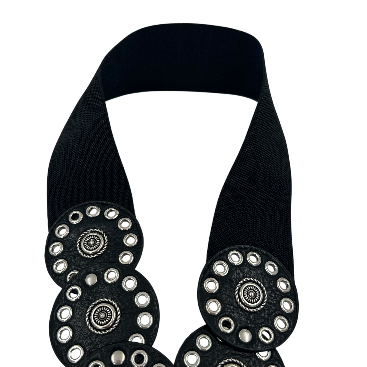 Η γυναικεία ζώνη Bohemian style σε μαύρη απόχρωση είναι μεγάλη τάση για το φθινόπωρο- χειμώνα 2025 διαθέτει ασημί κεντρική αγκράφα σε στρογγυλό σχήμα και μικρούς χρυσούς κύκλους που διακοσμούν τα δύο λουριά που την πλαισιώνουν. Στο ενδιάμεσο διαθέτει λάστιχο για μεγαλύτερη άνεση. Η ζώνη είναι χοντρή και μπορεί να φορεθεί με τα φουστάνια σας ώστε να δημιουργήσει εφέ μέσης και με τα τζιν σας. Μήκος ζώνης: 110 εκ. Πάχος: 7 εκ.