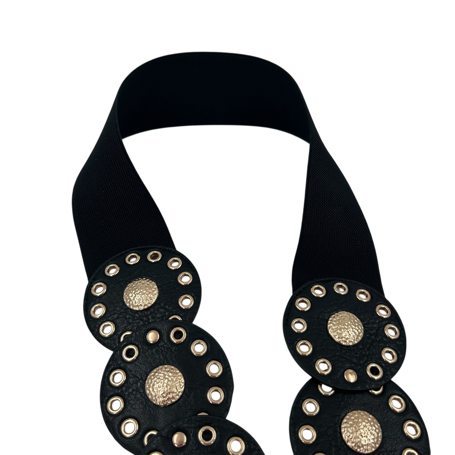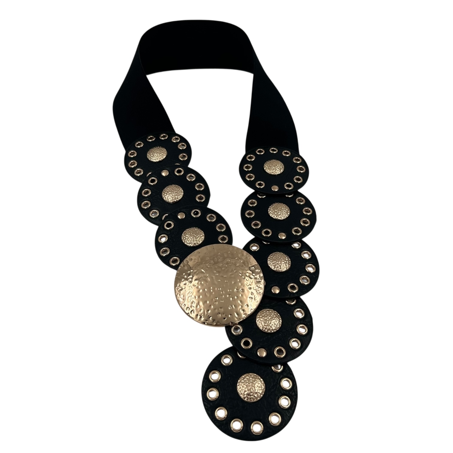 Η γυναικεία ζώνη Bohemian style σε μαύρη απόχρωση είναι μεγάλη τάση για το φθινόπωρο- χειμώνα 2025 διαθέτει χρυσή κεντρική αγκράφα σε στρογγυλό σχήμα και μικρούς χρυσούς κύκλους που διακοσμούν τα δύο λουριά που την πλαισιώνουν. Στο ενδιάμεσο διαθέτει λάστιχο για μεγαλύτερη άνεση. Η ζώνη είναι χοντρή και μπορεί να φορεθεί με τα φουστάνια σας ώστε να δημιουργήσει εφέ μέσης και με τα τζιν σας. Μήκος ζώνης: 110 εκ. Πάχος: 8 εκ.