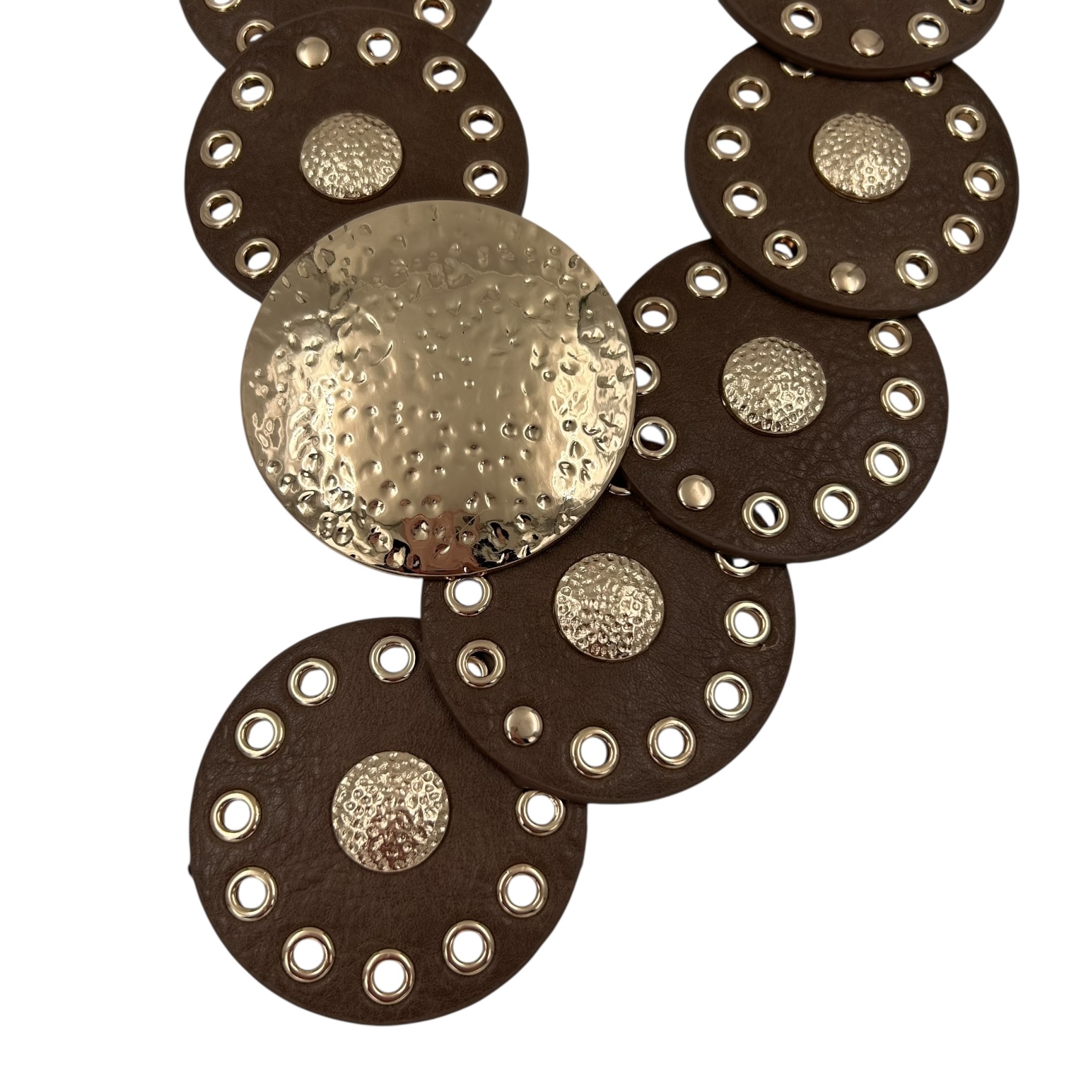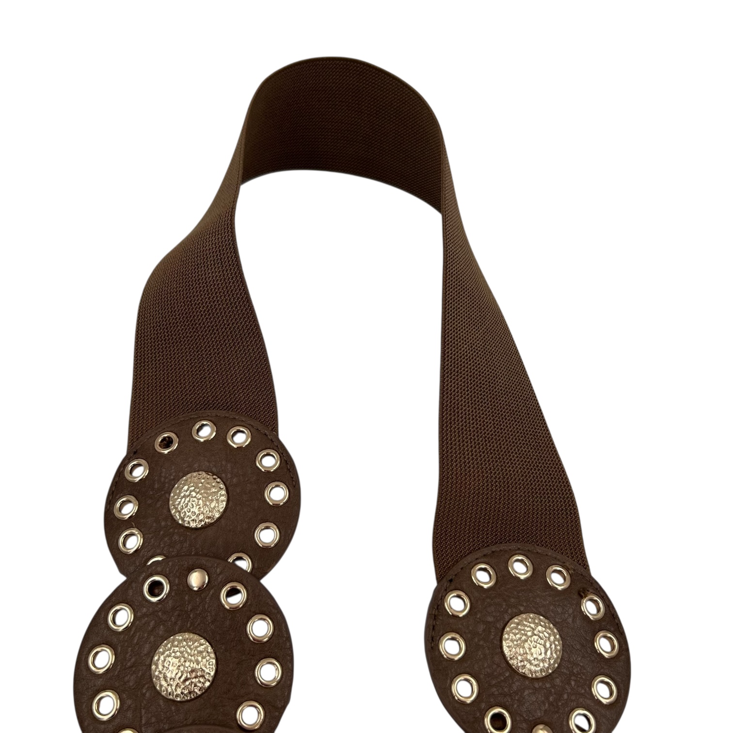 Η γυναικεία ζώνη Bohemian style σε greige απόχρωση είναι μεγάλη τάση για το φθινόπωρο- χειμώνα 2025 διαθέτει χρυσή κεντρική αγκράφα σε στρογγυλό σχήμα και μικρούς χρυσούς κύκλους που διακοσμούν τα δύο λουριά που την πλαισιώνουν. Στο ενδιάμεσο διαθέτει λάστιχο για μεγαλύτερη άνεση. Η ζώνη είναι χοντρή και μπορεί να φορεθεί με τα φουστάνια σας ώστε να δημιουργήσει εφέ μέσης και με τα τζιν σας. Μήκος ζώνης: 110 εκ. Πάχος: 8 εκ.