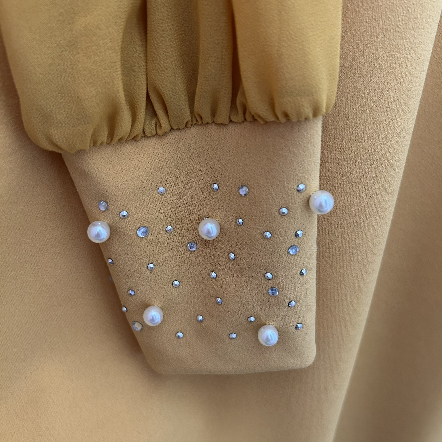 Φόρεμα μακρυμάνικο κίτρινο σε Α γραμμή με λεπτομέρειες στις μανσέτες από πέρλες και στρας. One size , διαστάσεις: 100εκ στήθος,100 εκ μέση, 110εκ περιφέρεια, 90εκ ύψος. Σύνθεση υφάσματος: 95% polyester & % elastan.