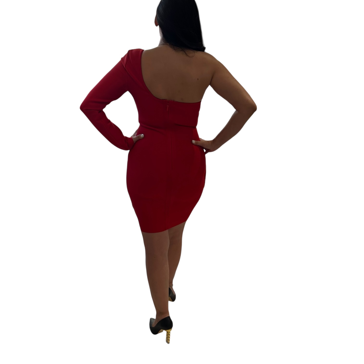 Κόκκινο φόρεμα μίνι από ελαστικό ύφασμα (bandgage) που σμιλεύει το γυναικείο σώμα με λεπτομέρειες από δαντέλα σε χρώμα κόκκινο. Διάθετει φερμουάρ στη πίσω πλευρά. Size: M/L