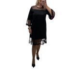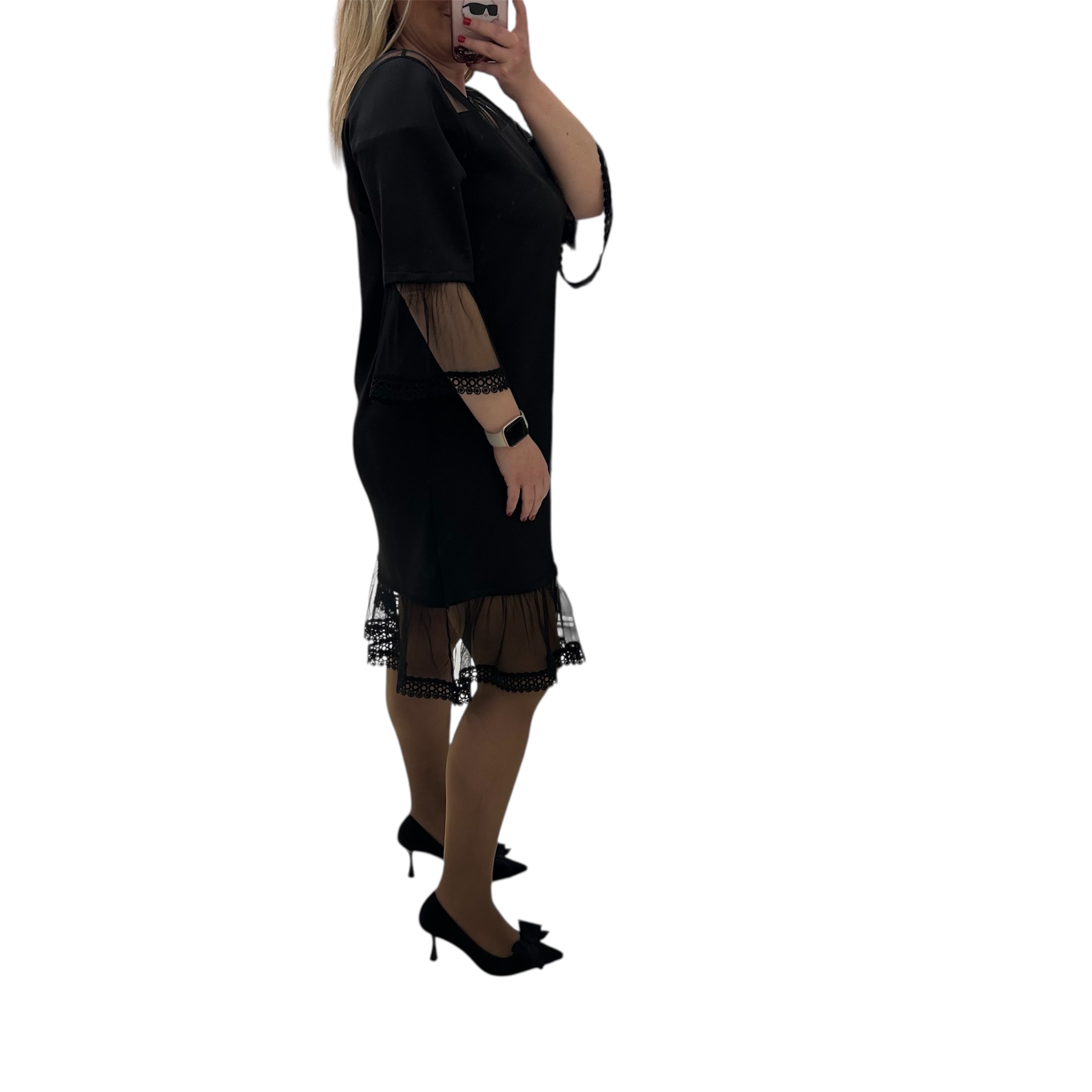 Μαύρο φόρεμα με κοντό μανίκι One size και λεπτομέρειες από τούλι στο ντεκολτέ, στο τελείωμα του μανικιού και στο κάτω μέρος. Διαστάσεις: Στήθος:112 εκ, Μέση:112 εκ, Περιφέρεια: 112 ek. Σύνθεση:50% viscose, 45% polyester, 5% elastan