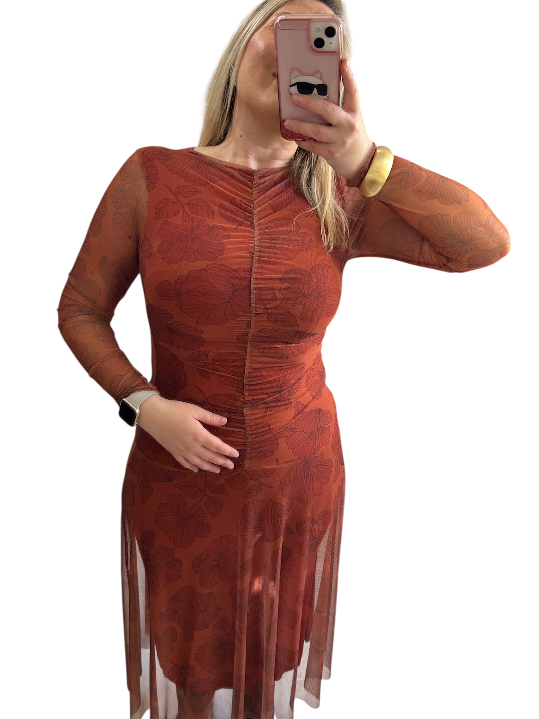 One size φόρεμα μακρυμάνικο πορτοκαλί εκάι με σούρες σε όλο το μήκος του. Διαθέτει μεσοφόρι εσωτερικά ραμμένο. Διαστάσεις: Στήθος: έως 110 εκ.Μέση: έως 90 εκ.Περιφέρεια: έως 120 εκ. Σύνθεση: 80% polyester,20% elastan, μεσοφόρι: 95% viscose, 5% elastan.