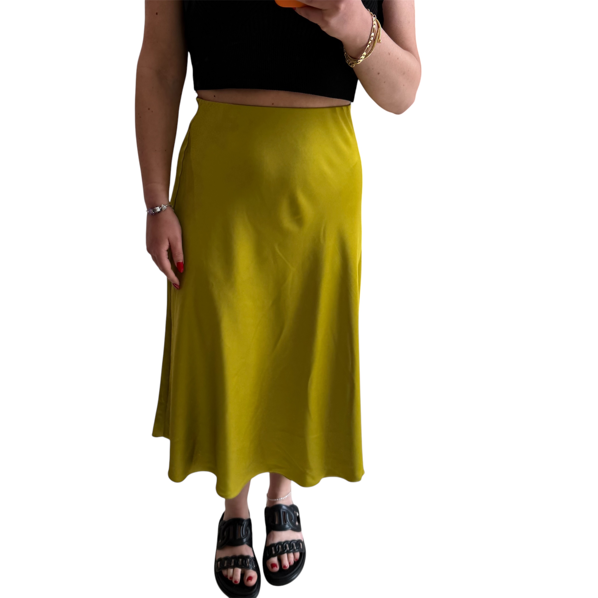 One size φούστα Midi lime ψηλόμεση με λάστιχο στη μέση. Διαστάσεις: Μέση: 70 εκ. έως 90 εκ. Ύψος: 80 εκ. Σύνθεση: 100% viscose