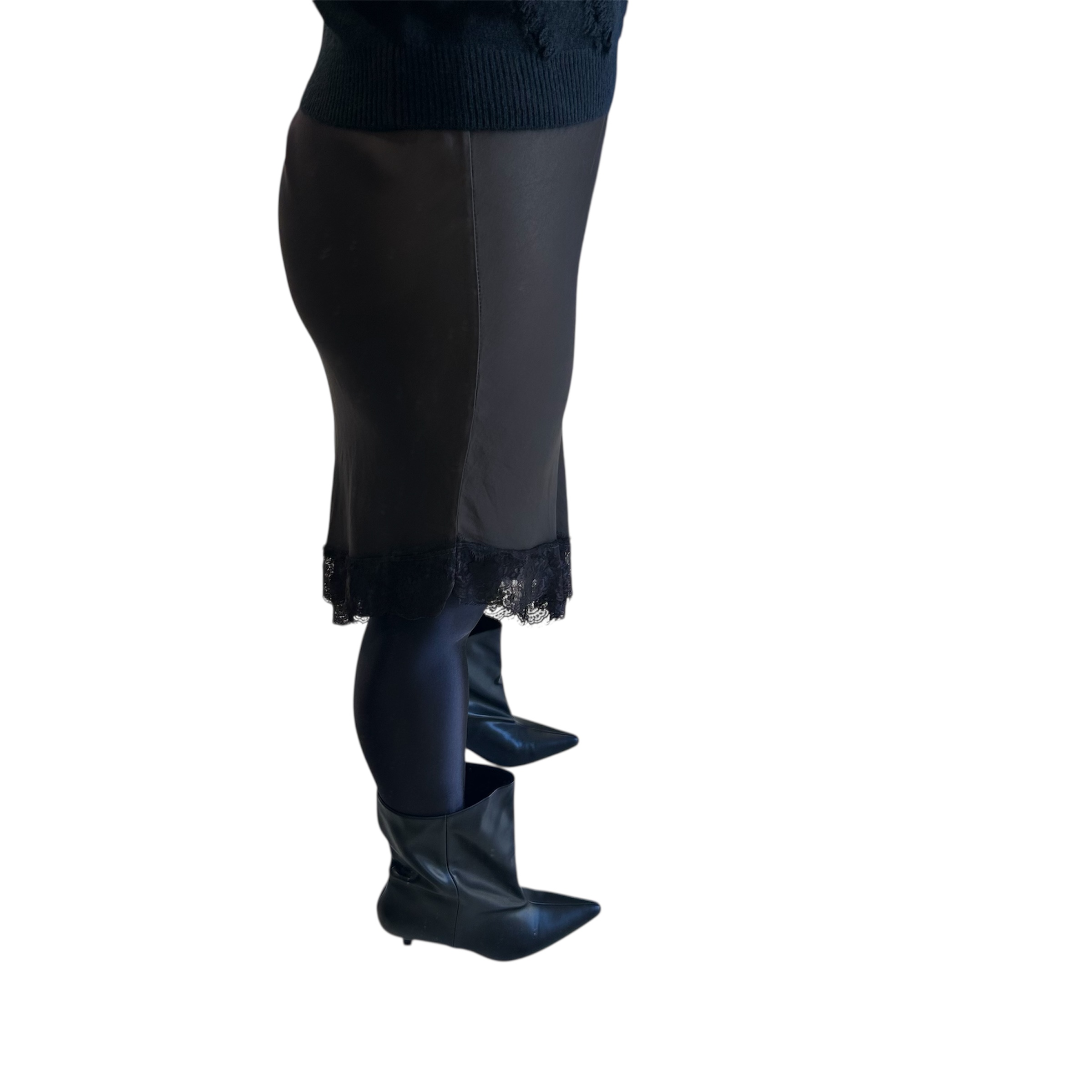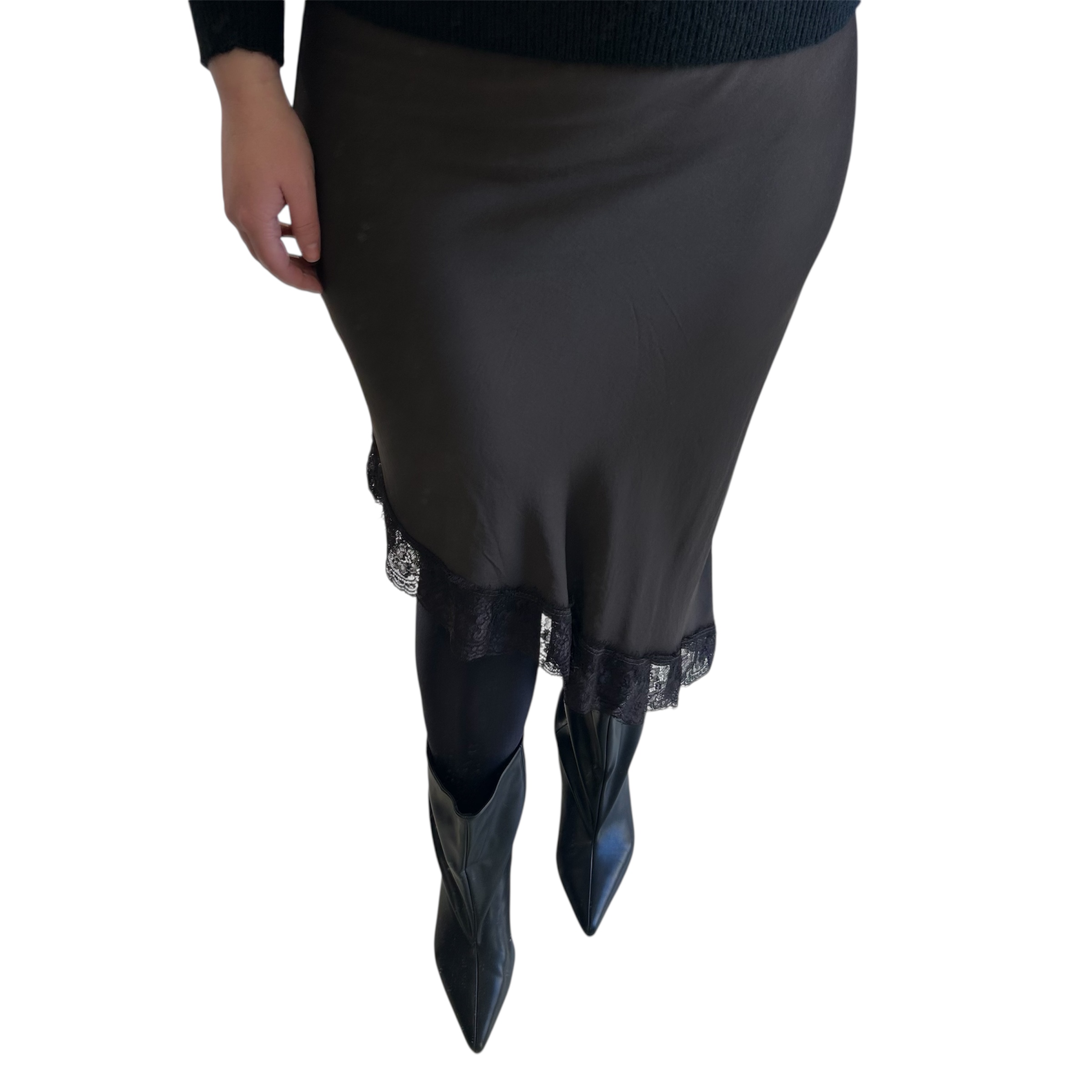 One size φούστα σατέν με ασύμετρο μήκος με τελειώματα δαντέλας. Διαθέτει λάστιχο στη μέση. Διαστάσεις:Μέση: 75 εκ.έως 90 εκ., Περιφέρεια:έως 120 εκ. Σύνθεση: 70% viscose,30% silk