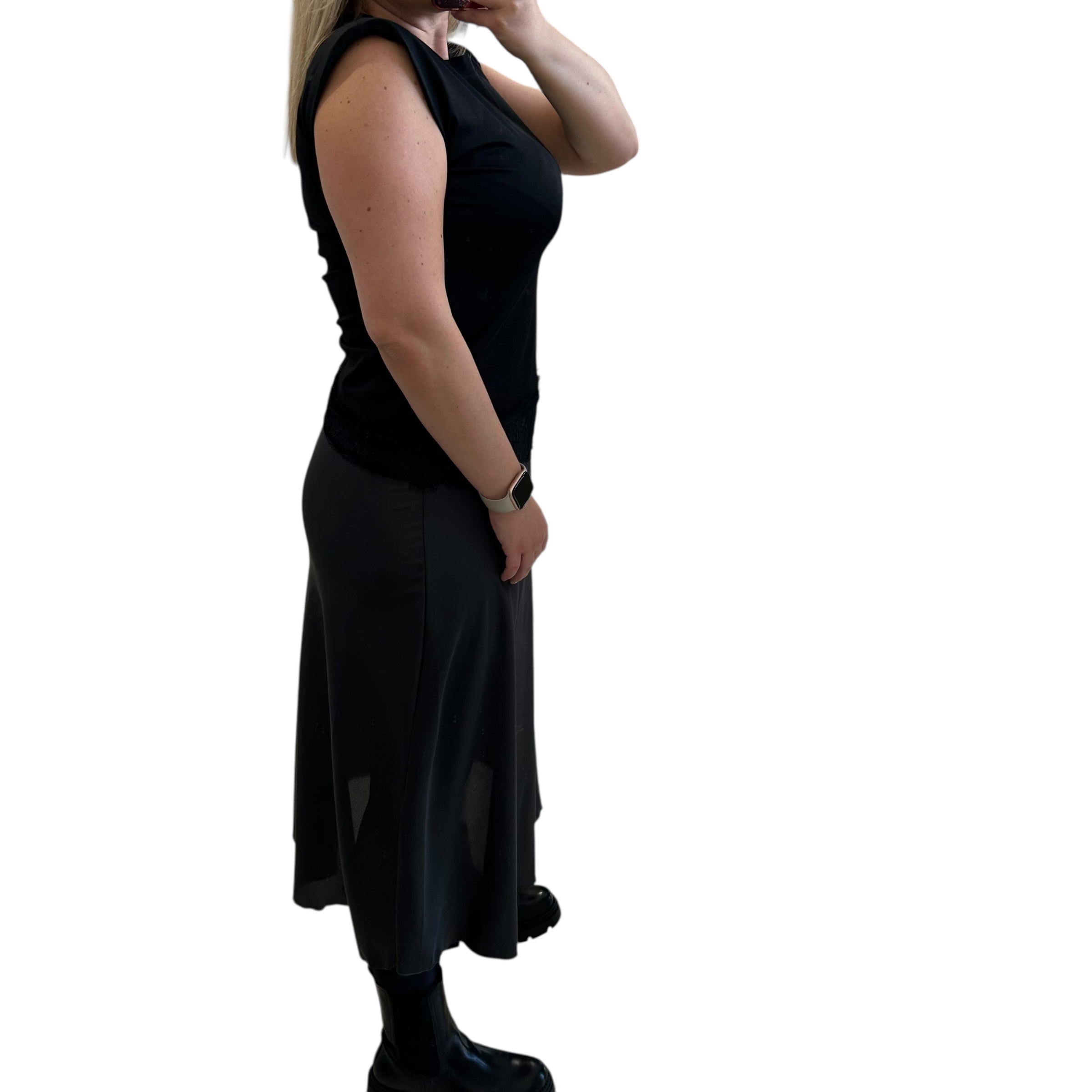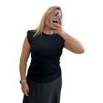 Μπλούζα μάυρη one size με δαντέλα στο τελείωμα, αμάνικη με βάτες και στρογγυλή λαιμόκοψη. Διαστάσεις: Στήθος: έως 100εκ. Σύνθεση: 53% viscose 40% nylon7% elastan