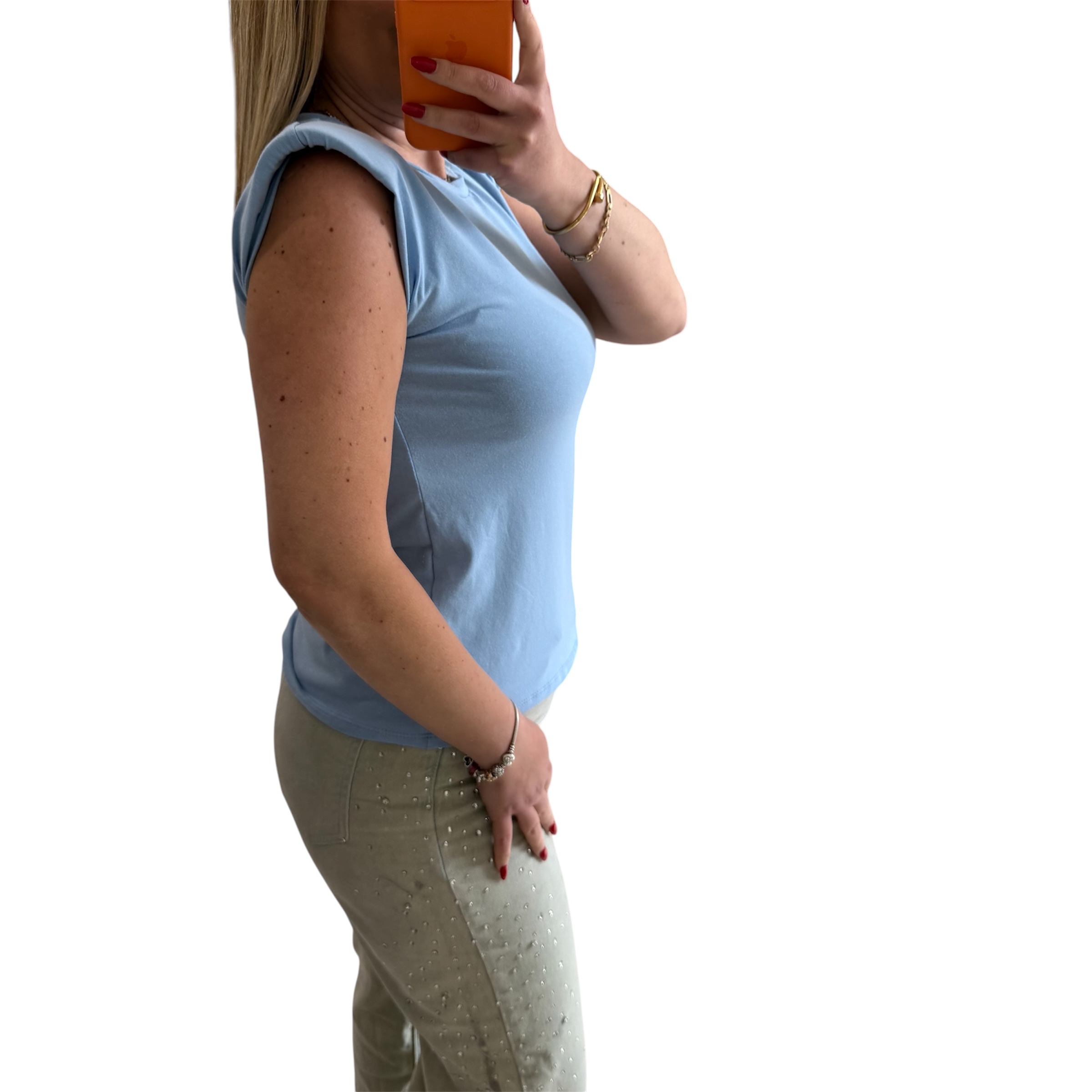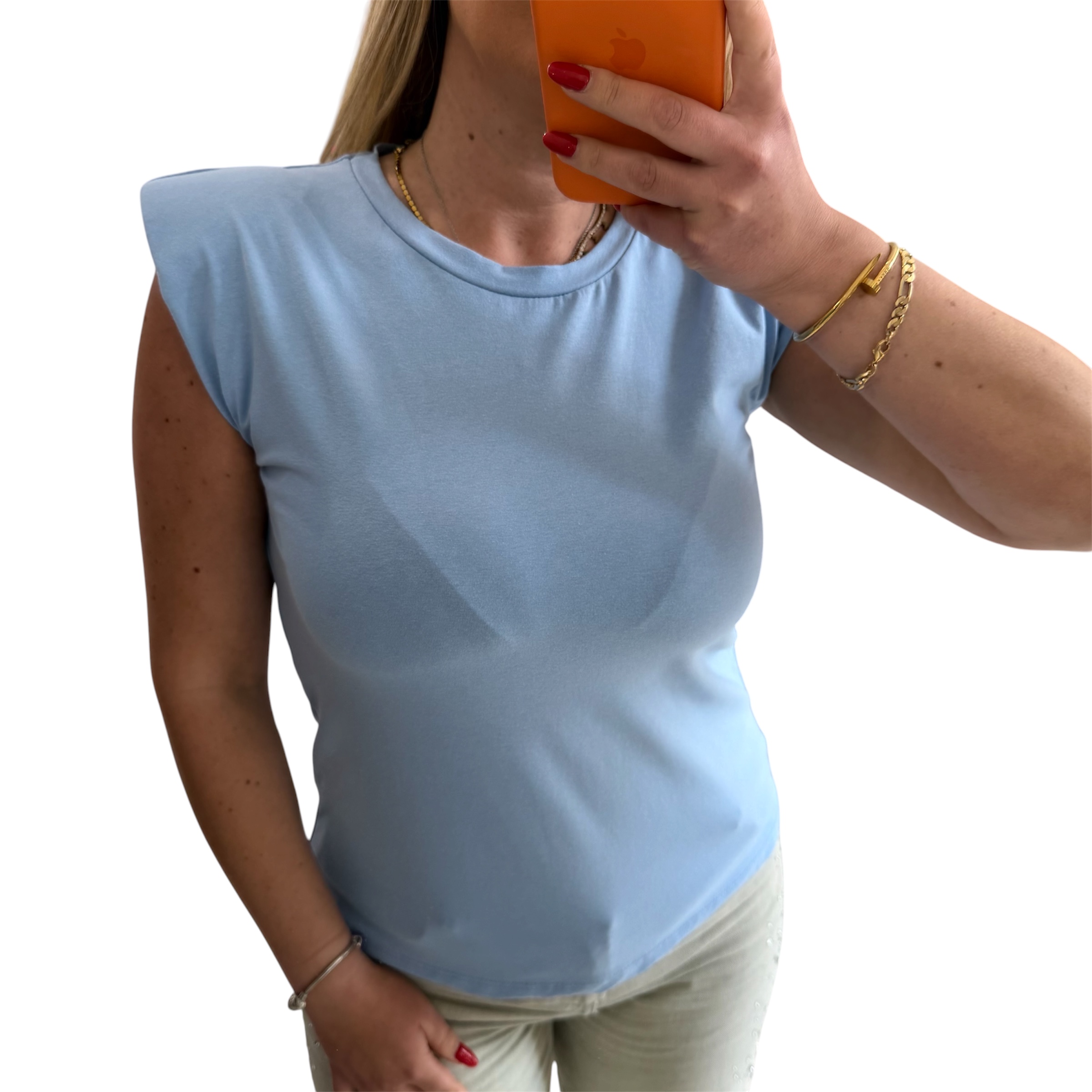 One size αμάνικη μπλούζα σιέλ με βάτες στους ώμους. Διαστάσεις: Στήθος: 100 εκ. έως 120 εκ. Σύνθεση:95% cotton, 5% elastan