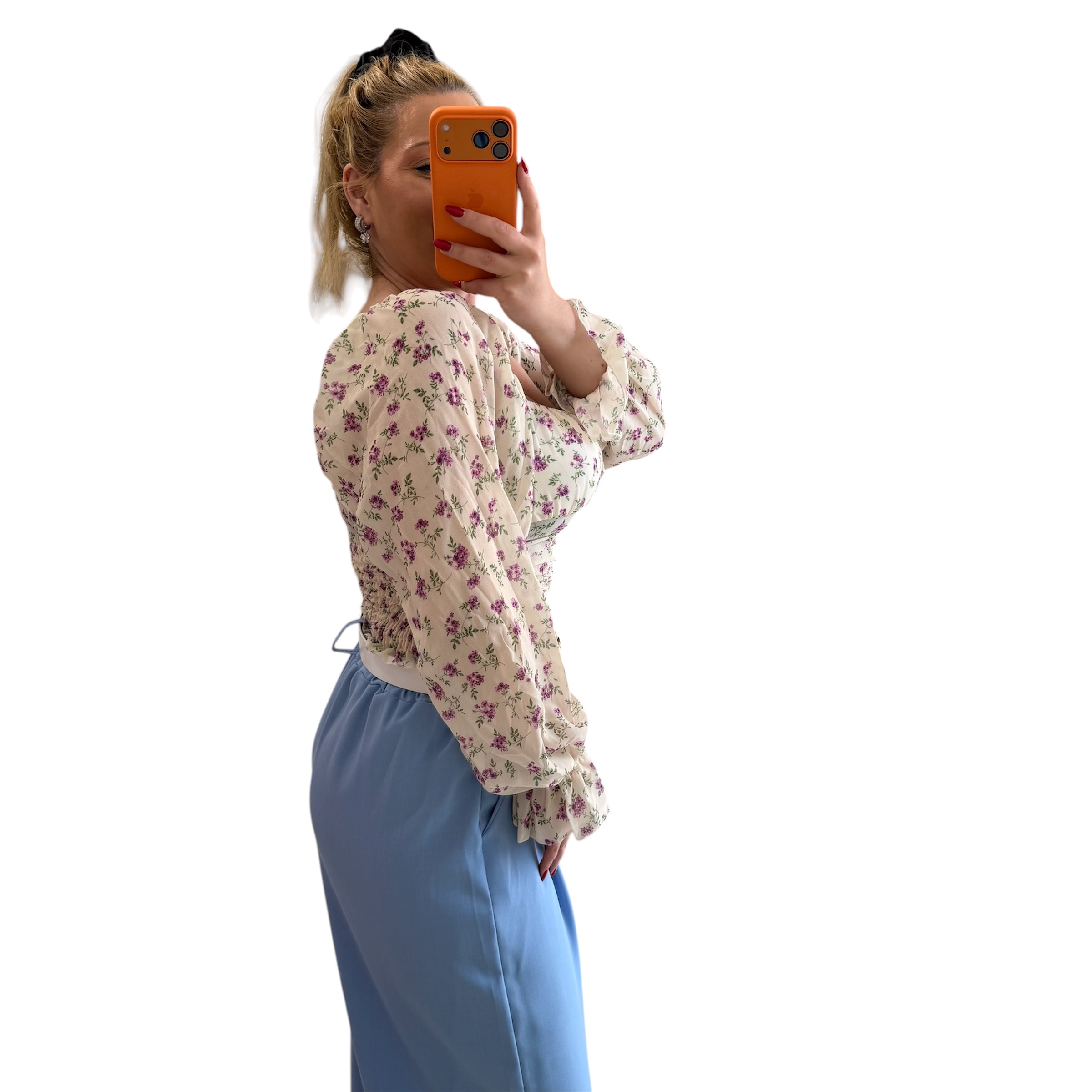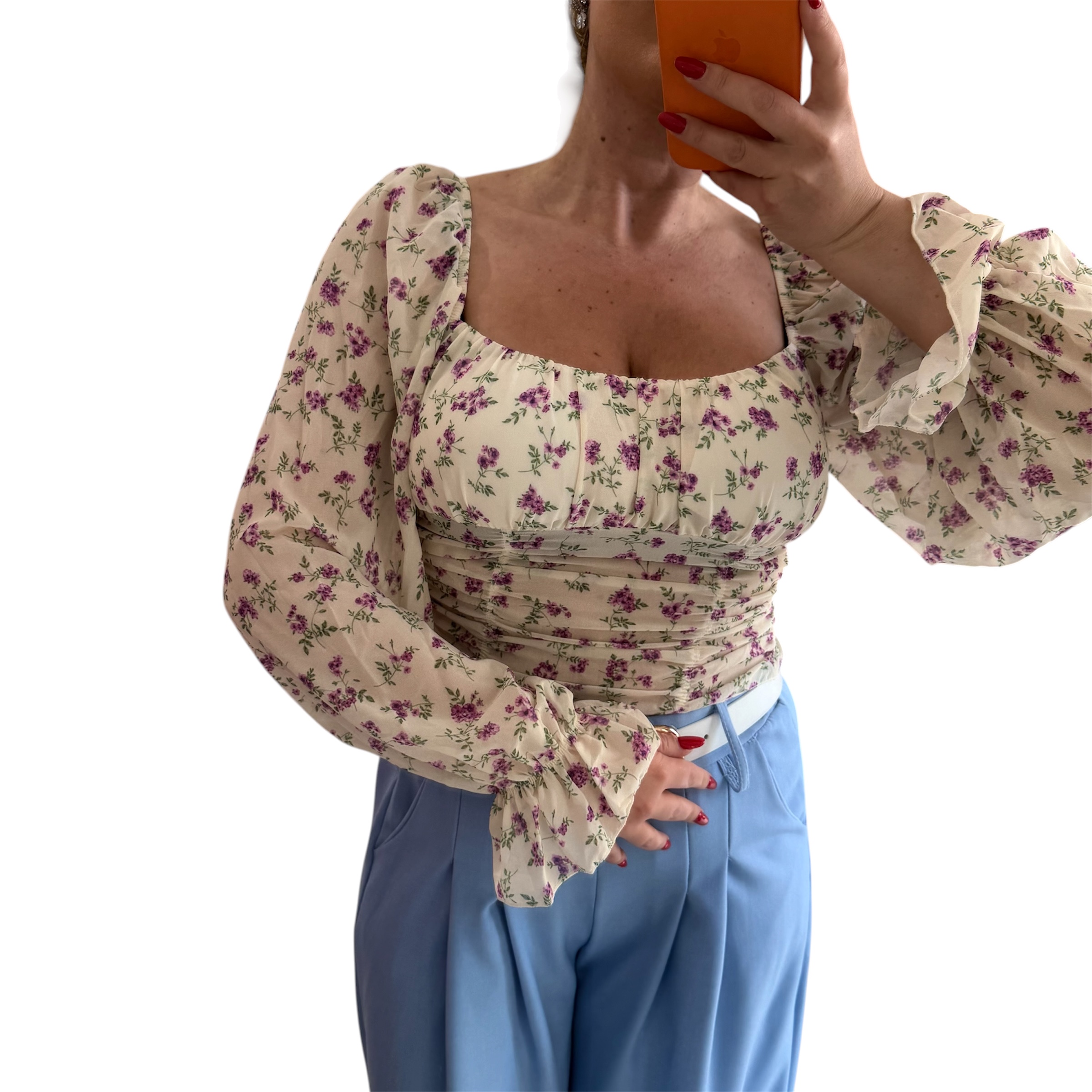One size μπλούζα μακρυμάνικη εκρού με λιλά λουλουδάκια και πράσινα φυλλαράκια. Διαθέτει cups και σφηκοφωλιά στο πίσω μέρος. Διαστάσεις: Στήθος: 80 εκ. έως 105 εκ. Σύνθεση:95% viscose, 5% elastan