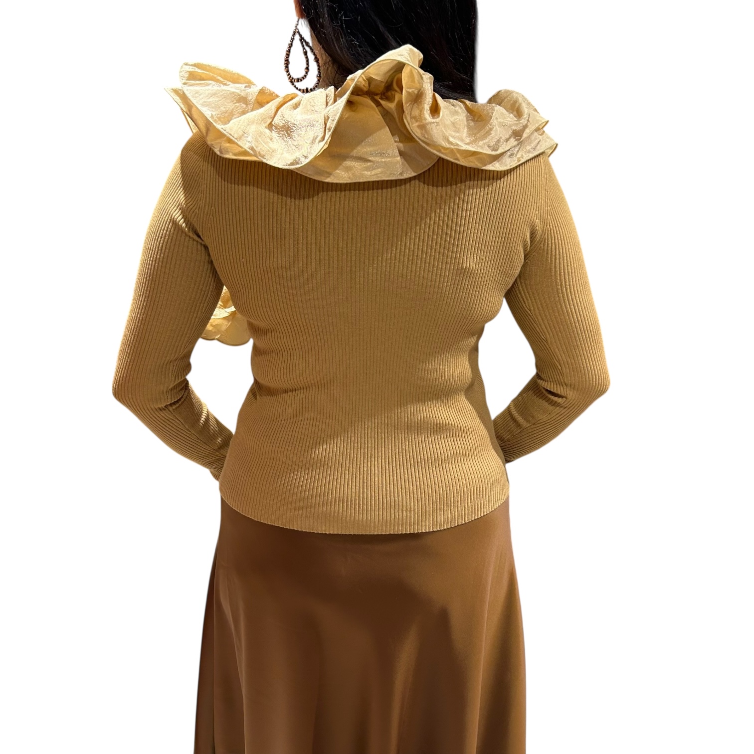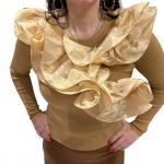 One size μπλούζα πλεκτή με σχέδιο από βολάν περιμετρικά. Καλύπτει έως Large. Σύνθεση υφάσματος: 51% viscose, 39% polyamide, 10% elastan