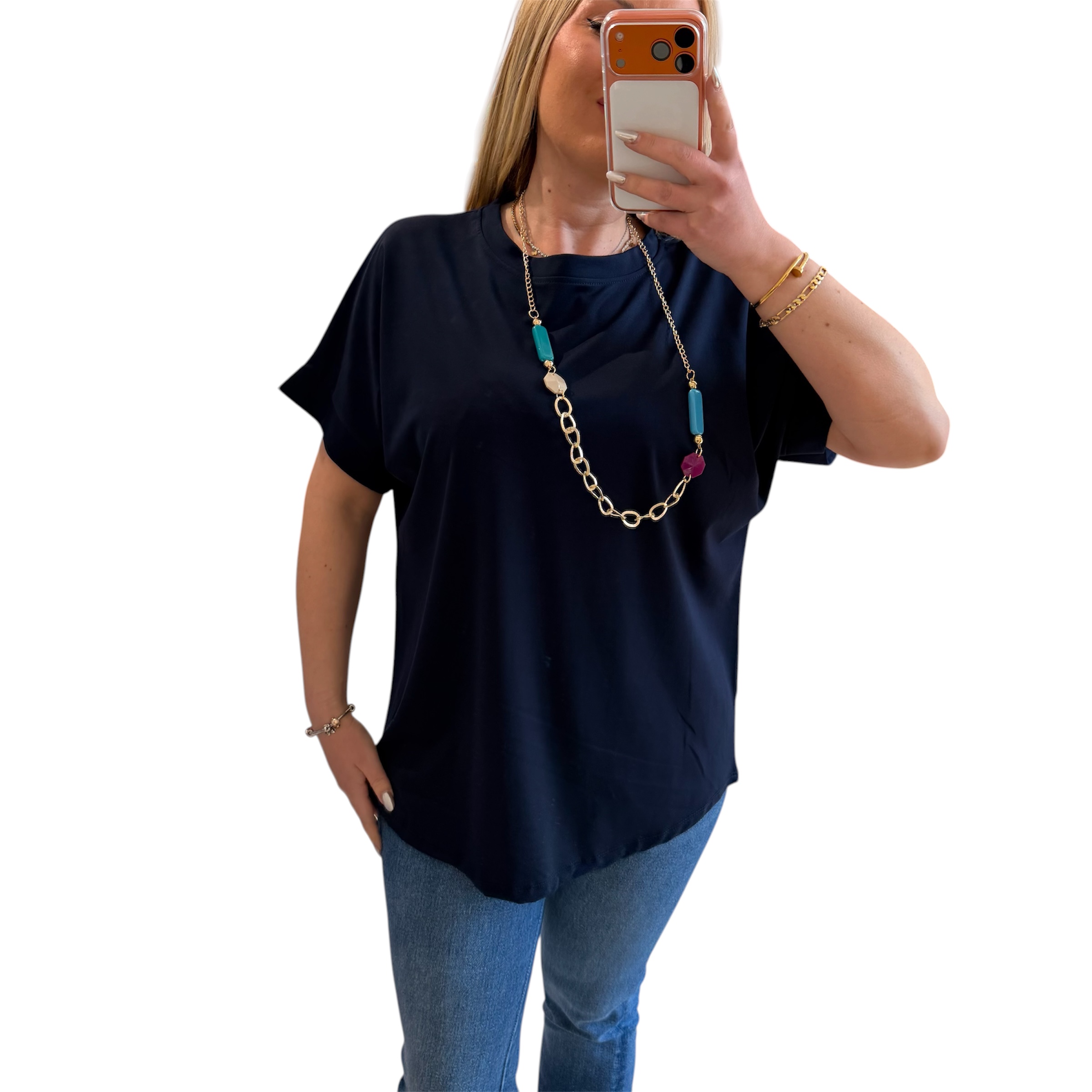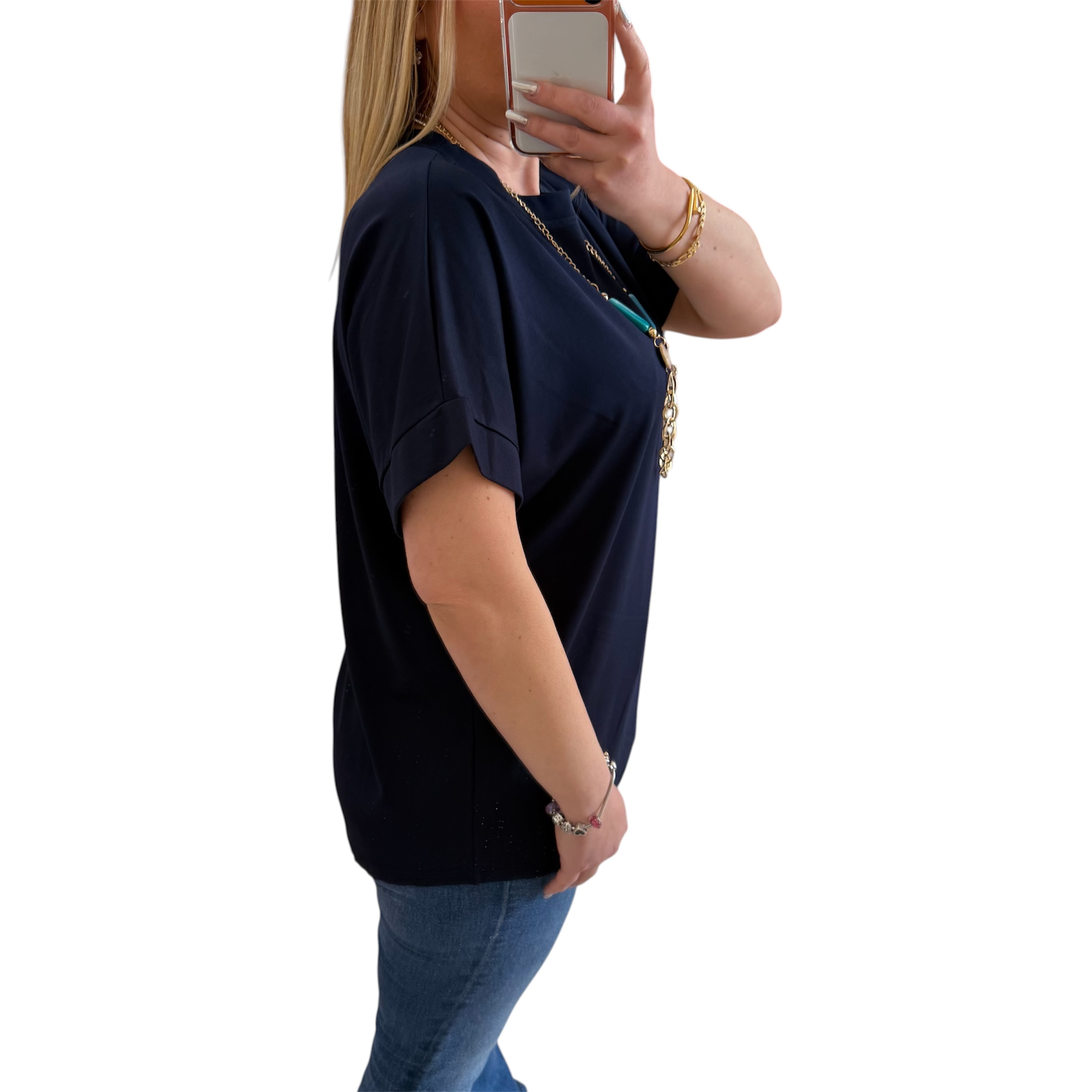 One size μπλούζα ροζ με κόσμημα διακοσμηνένο με πέτρες σε χρυσή απόχρωση. Διαστάσεις: Στήθος: 140 εκ. Περιφέρεια: 130 εκ. Σύνθεση: 95% viscose & 5% elastan