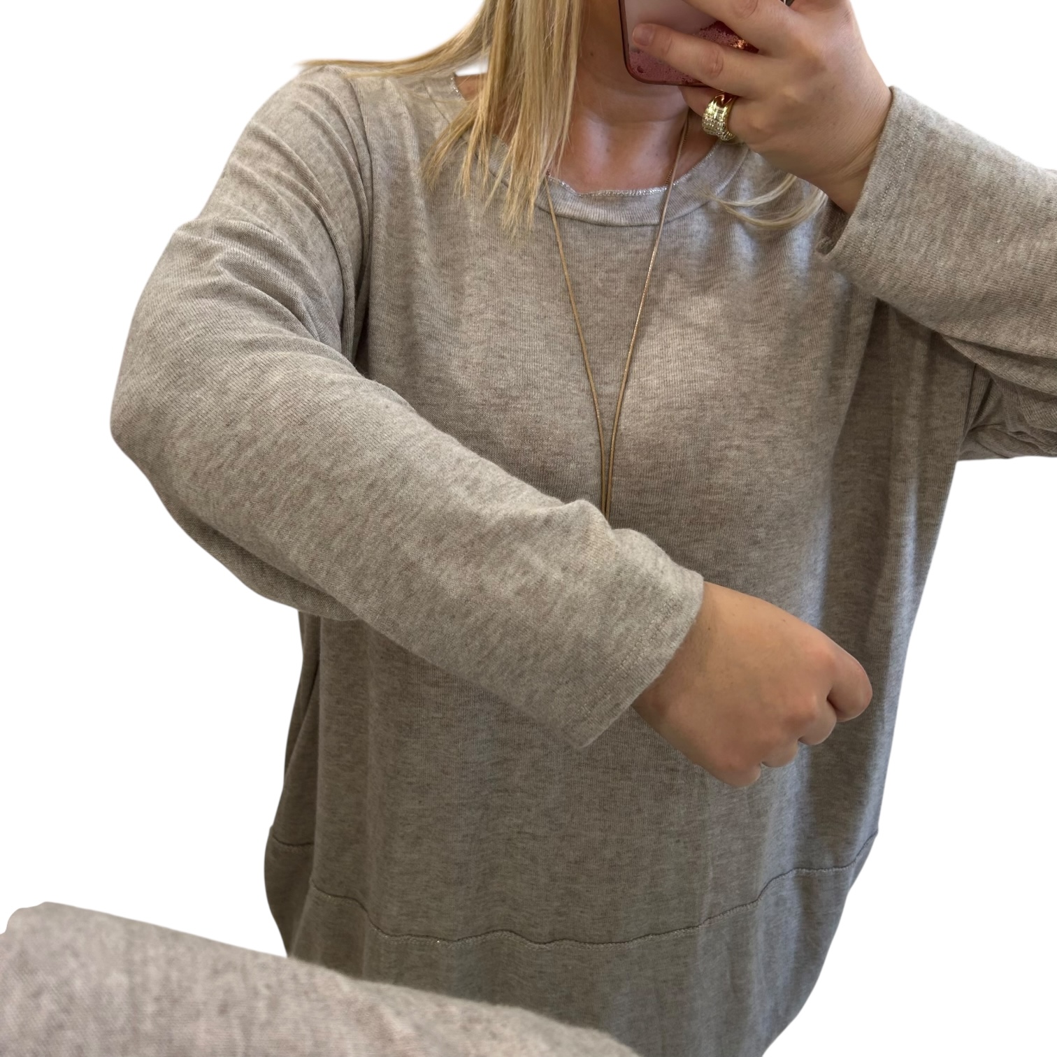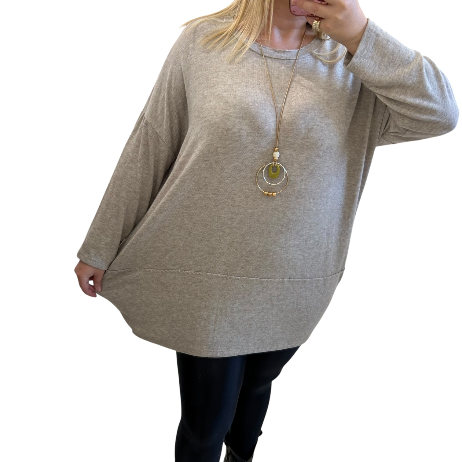 One size μπλουζοφόρεμα σε greige απόχρωση. Περίμετρος: καλύπτει έως 140εκ. Σύνθεση : 55% modal, 45% acrylic