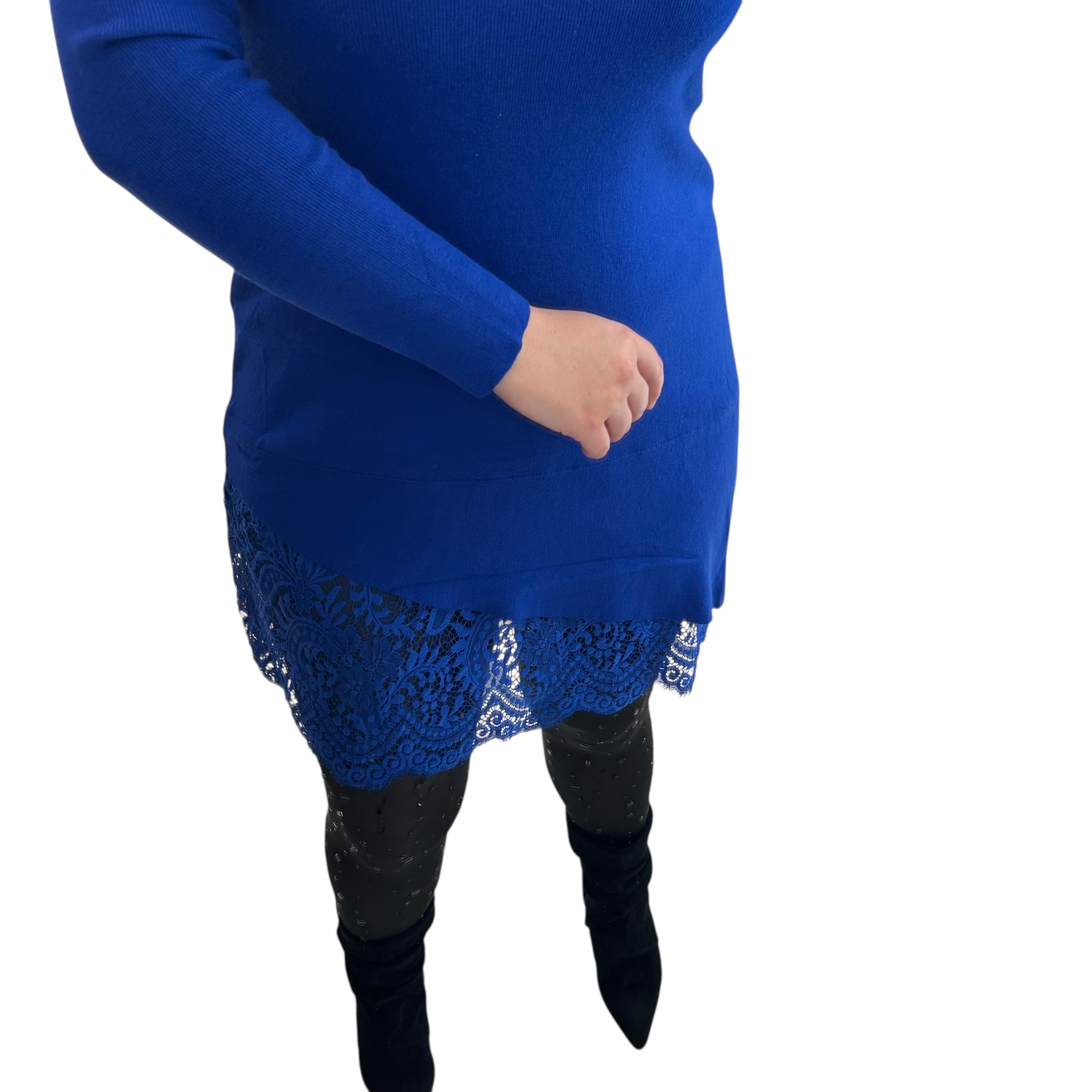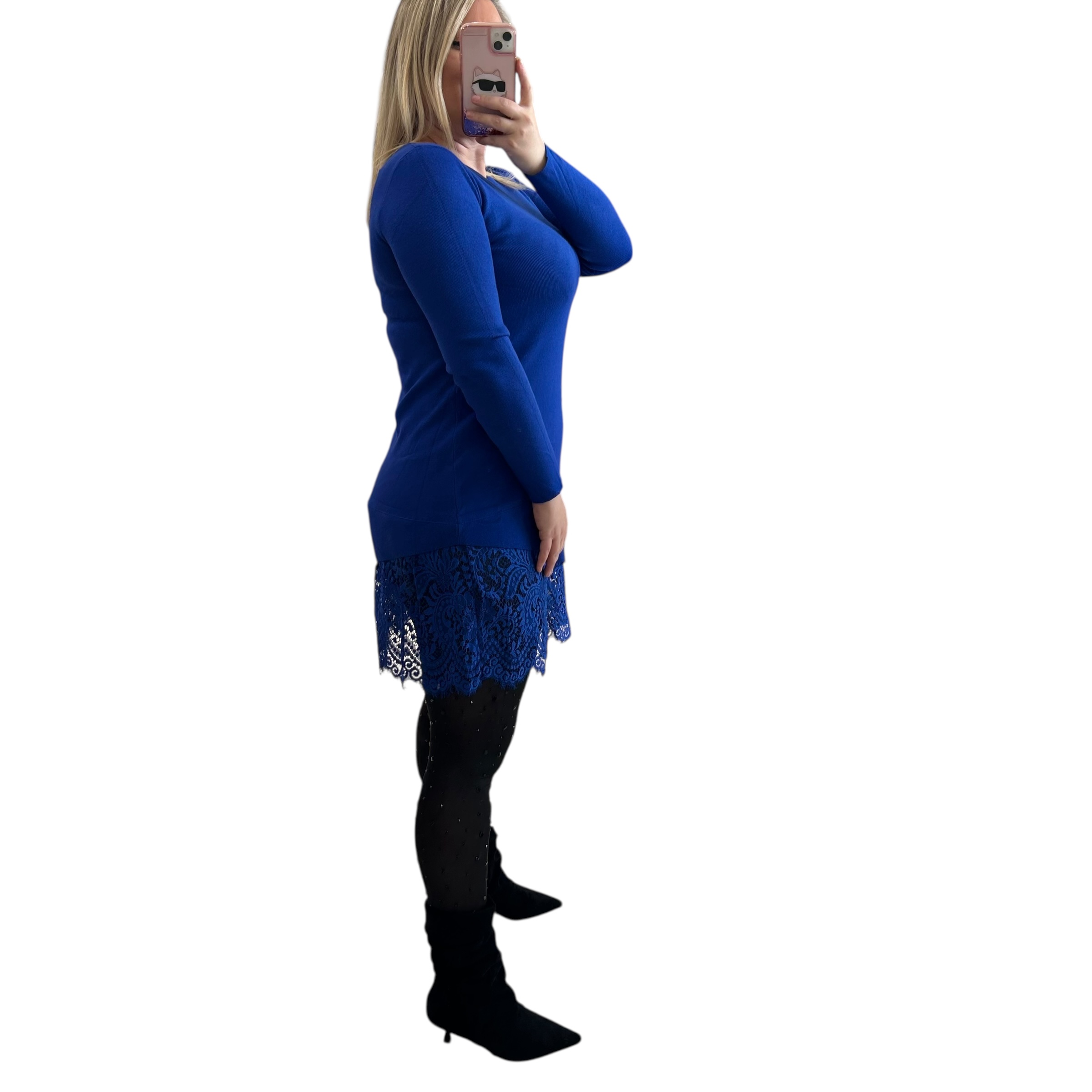 Μπλουζοφόρεμα πλεκτό λεπτό με λαιμόκοψη σε απόχρωση μπλε ρουά. Στο πίσω μέρος διαθέτει άνοιγμα με δαντέλα. Αρκετά μαλακό πλεκτό και ελαστικό. Διαστάσεις: Στήθος: έως 120 εκ., Περιφέρεια: έως 130 εκ. Σύνθεση:30% viscose,20% modal,30% polyamide, 20% elastan