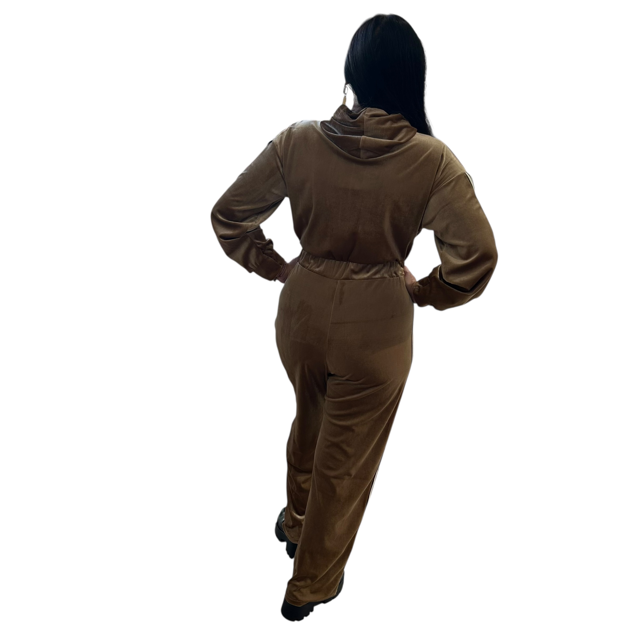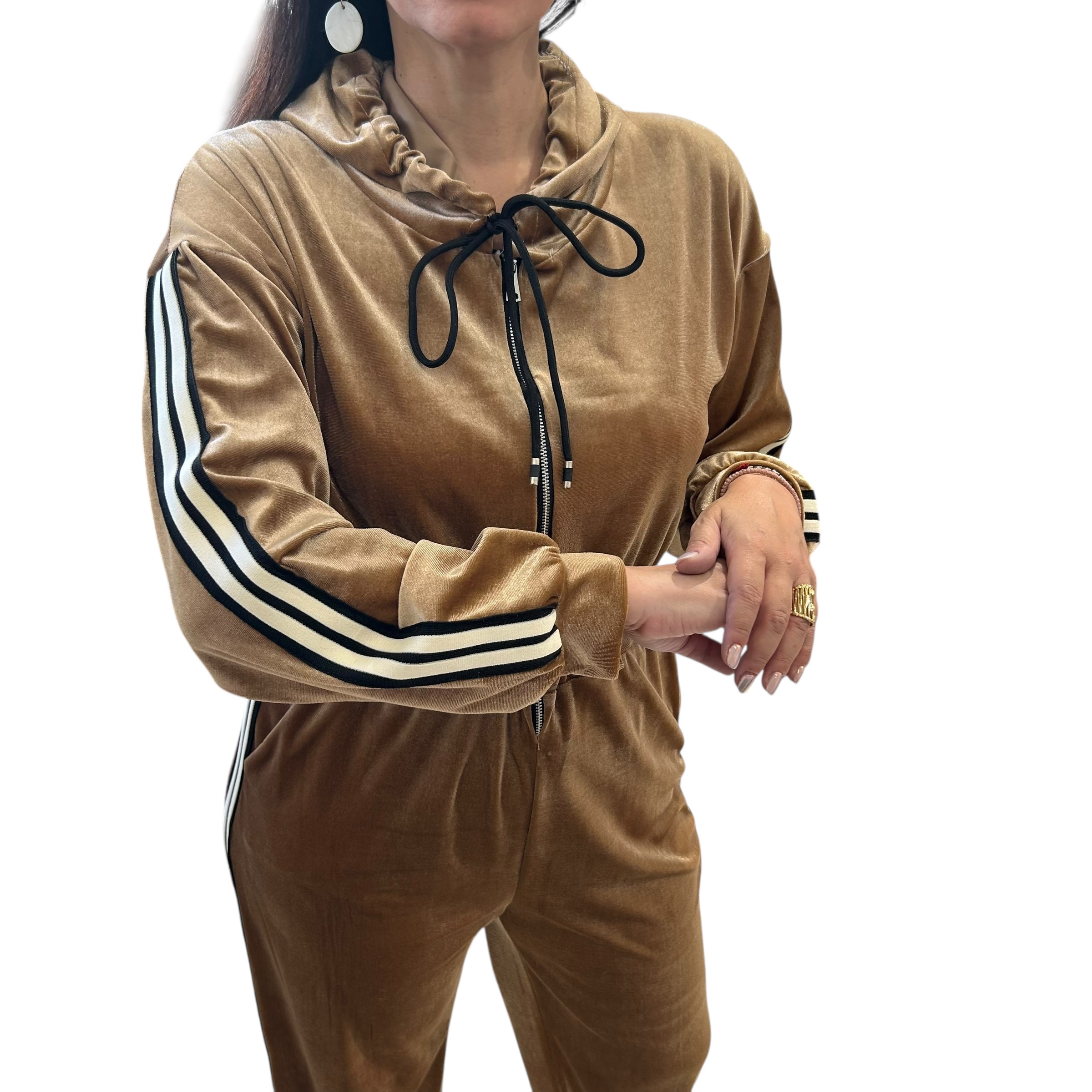 One size Ολόσωμη φόρμα βελουτέ Μπεζ με ρίγες. Διαθέτει φερμουάρ μπροστά , κουκούλα και τσέπες στο παντελόνι. Διαστάσεις: Στήθος: έως 120εκ., Μέση: έως 100 εκ., Περιφέρεια: έως 120εκ. Σύνθεση: 95% polyester, 5% elastan