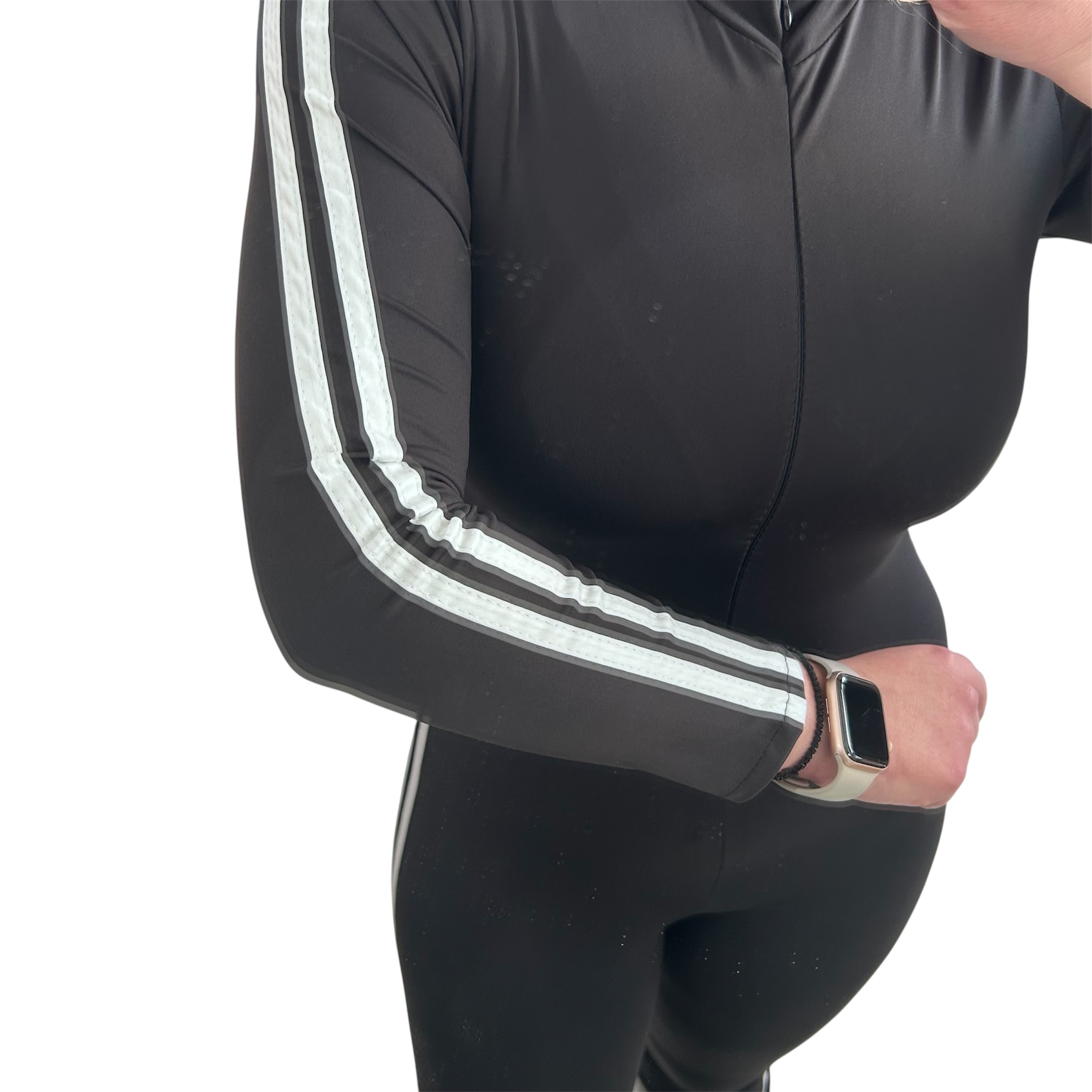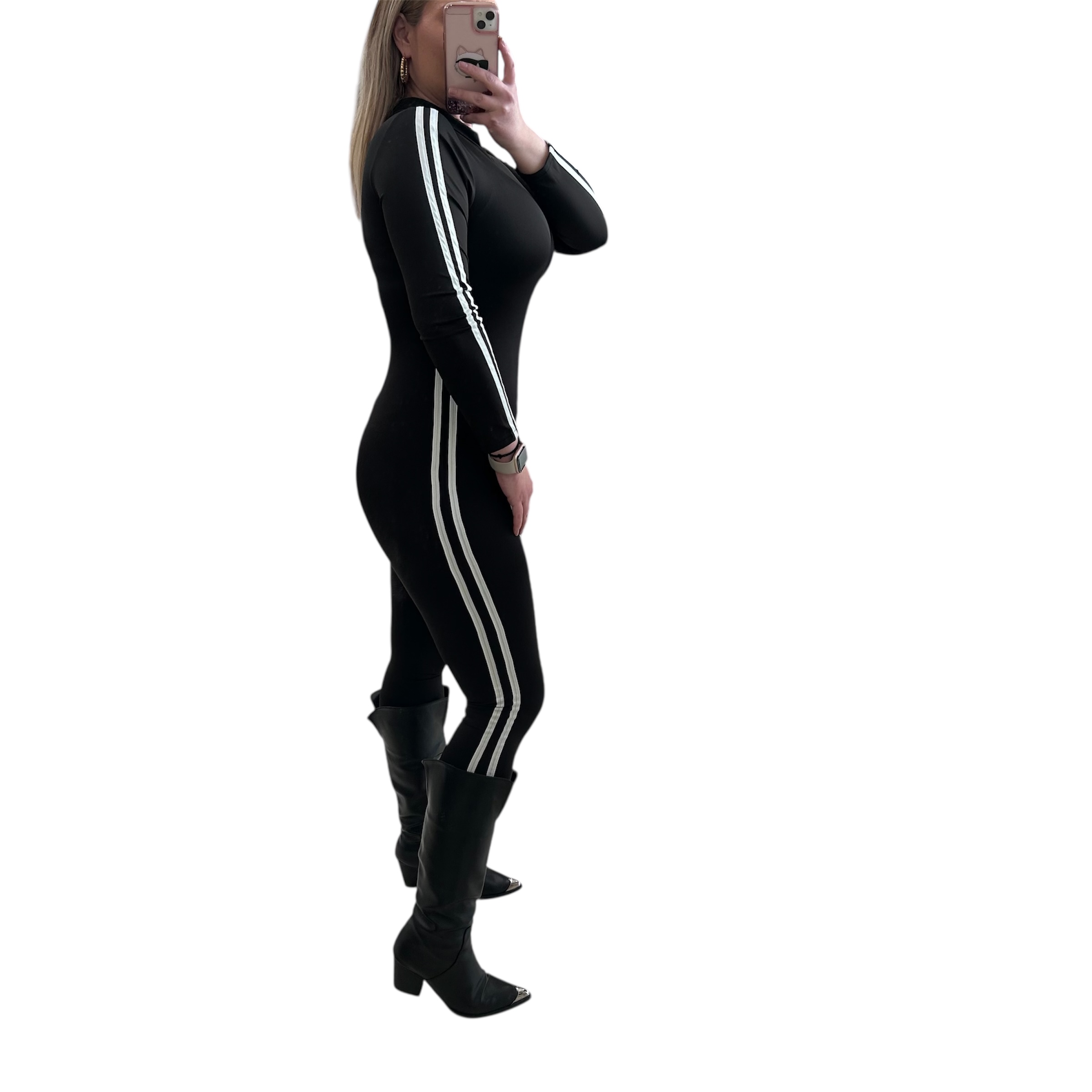 One size ολόσωμη φόρμα μακρυμάνικη μαύρη με λευκές ρίγες με φερμουάρ στο ντεκολτέ. Ελαστική ολόσωμη φόρμα μαύρη σε ίσια γραμμή, σωλήνας. Καλύπτει από xsmall έως xlarge. Σύνθεση:80% polyester % 20% elastan