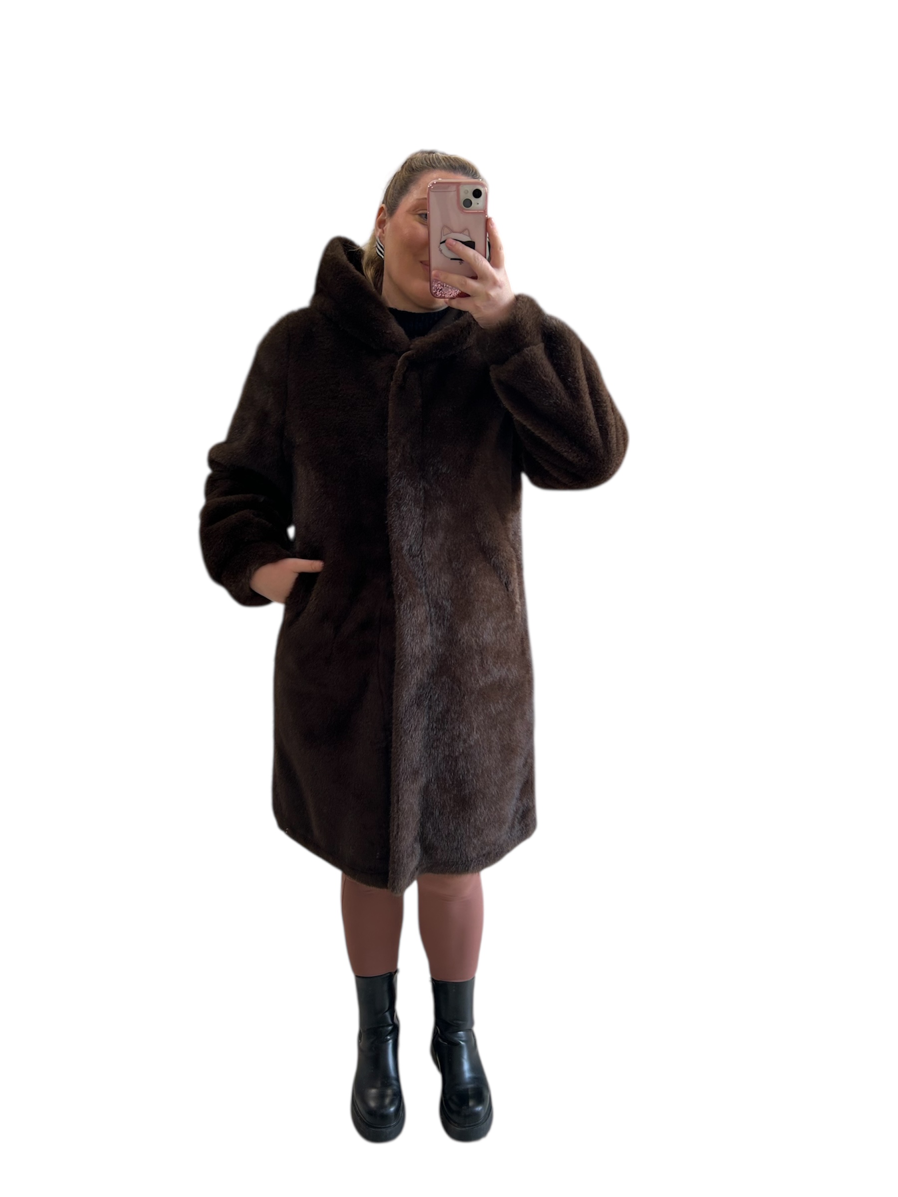 One size οικολογική γούνα καφέ σκούρο απόχρωση σε καταπληκτική ποιότητα μοιάζει με αληθινή γούνα. Διαθέτει κουκούλα και δυο πλαινές τσέπες. Διαθέτει 3 κουμπιά εσωτερικά για κλείσιμο στο μπροστινό μέρος. Διαστάσεις: Στήθος: 120 εκ, Περιφέρεια: 120 εκ., Σύνθεση: 100% polyester