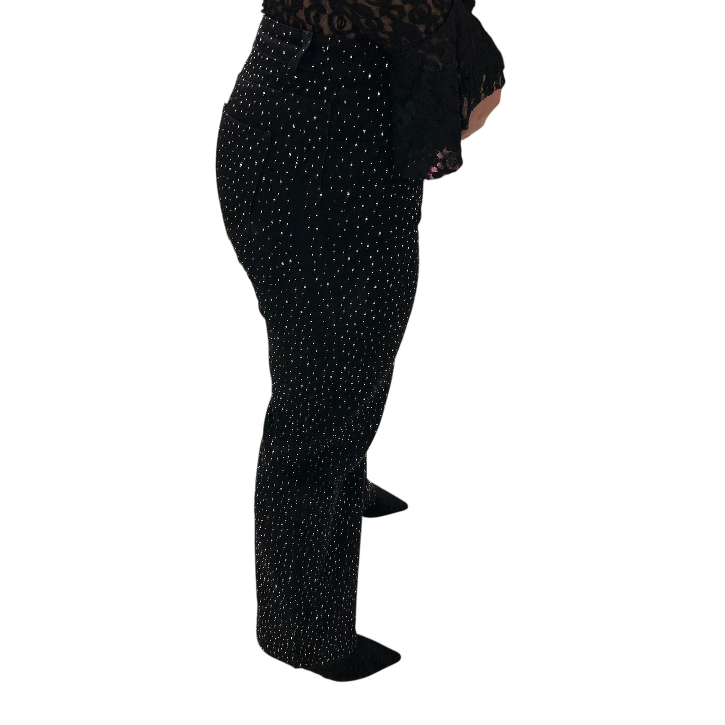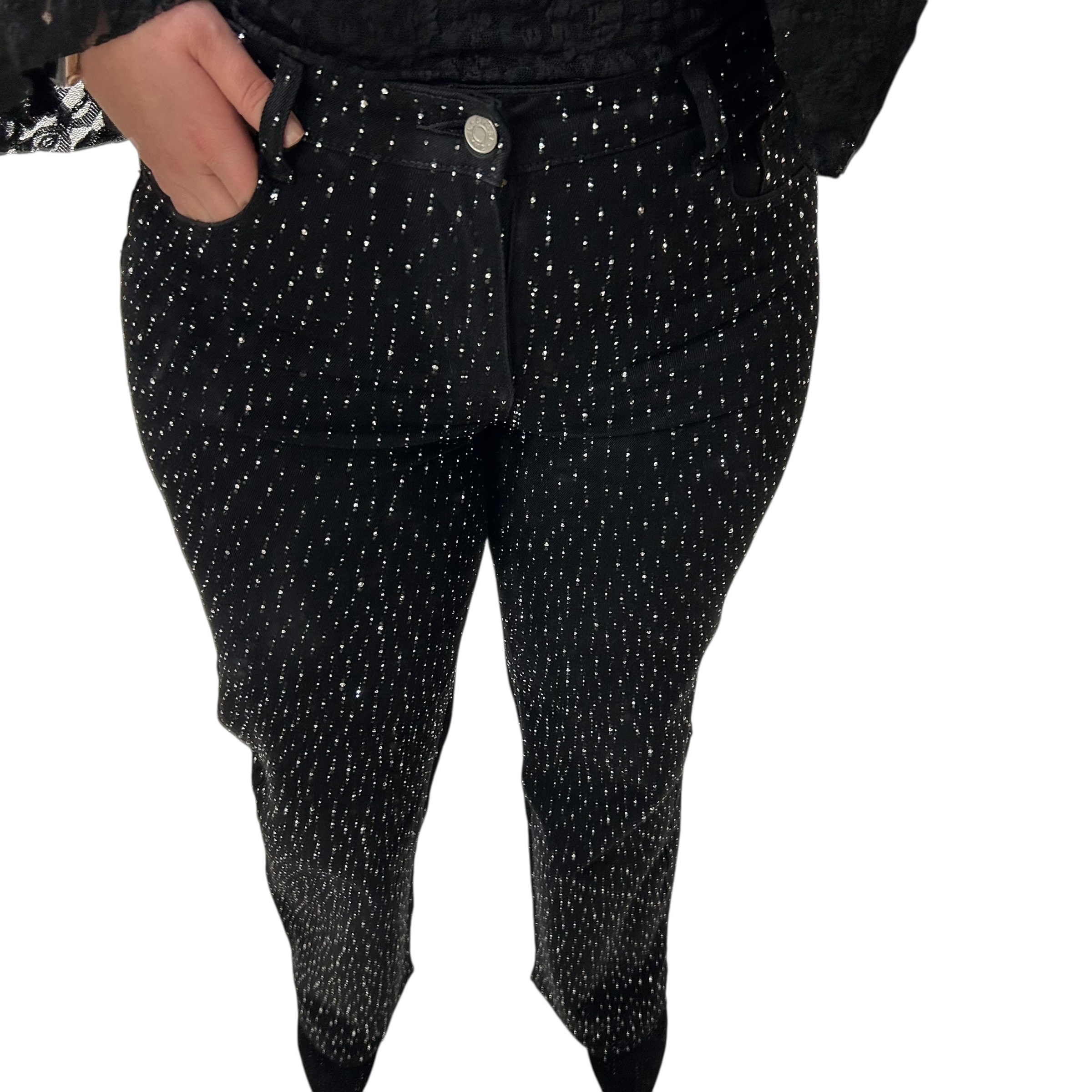 Ψηλόμεσο παντελόνι μαύρο, wide leg με denim ελαστικό ύφασμα. Τα στρας στο jean είναι παντού και στο μπροστινό μέρος και στο πίσω μέρος. Κλείνει με κουμπί και φερμουάρ στη μέση για άνετη εφαρμογή. Ιδανικό για εντυπωσιακές εμφανίσεις που συνδυάζουν casual και chic αισθητική. Διαθέτει ελαστικότητα αυτό το jean για άνεση. Μπορείς να το φορέσεις με ενα απλό T-shirt ή φούτερ και αθλητικά παπούτσια ή loafers για πρωινή εμφάνιση ή με ένα κορμάκι για εντυπωσιακή βραδινή εμφάνιση. Σύνθεση:70% cotton,28.5% polyester, 1.5% elastan Xsmall: 34, Small: 36, Medium: 38, Large: 40, Xlarge:42 size