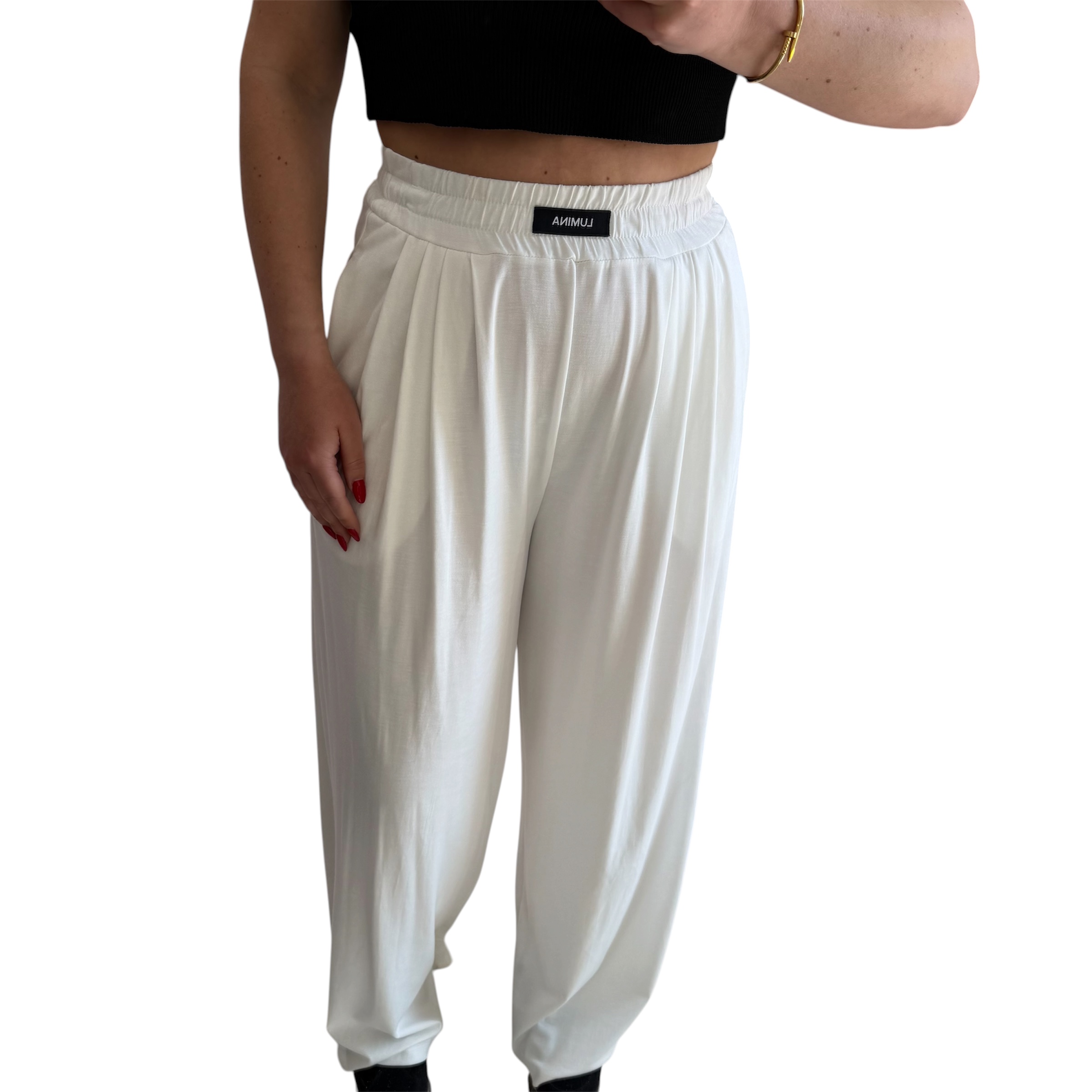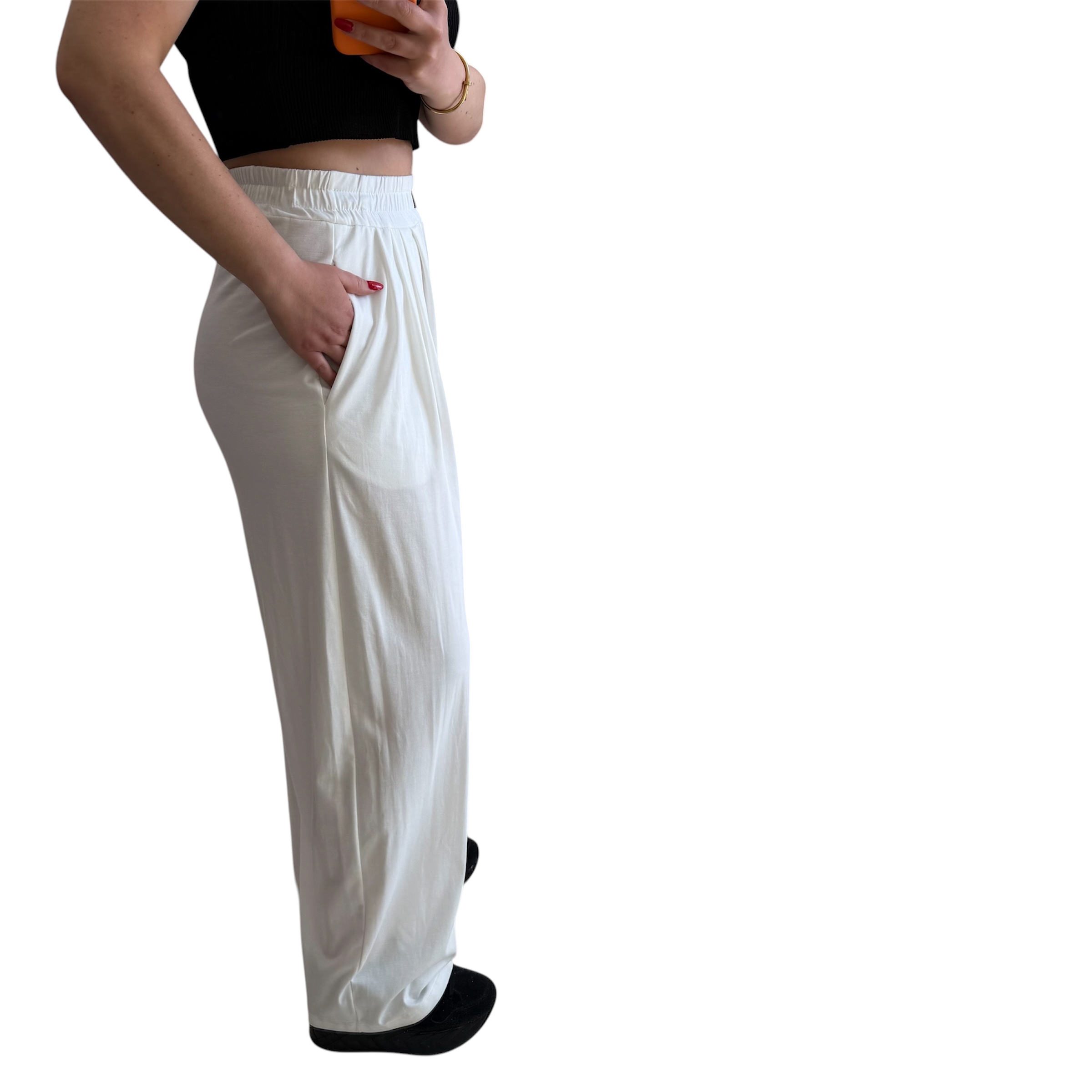 Παντελόνι της εταιρείας lumina λευκό με χοντρό λάστιχο στη μέση. Διαθέτει τσέπες και δεν διαφανίζει. Είναι διαθέσιμο σε νούμερα S/M & M/L. Έχουν κανονική εφαρμογή. Ύψος παντελονιού:112 εκ. Σύνθεση:65% viscose, 29% polyamide, 6% elastan