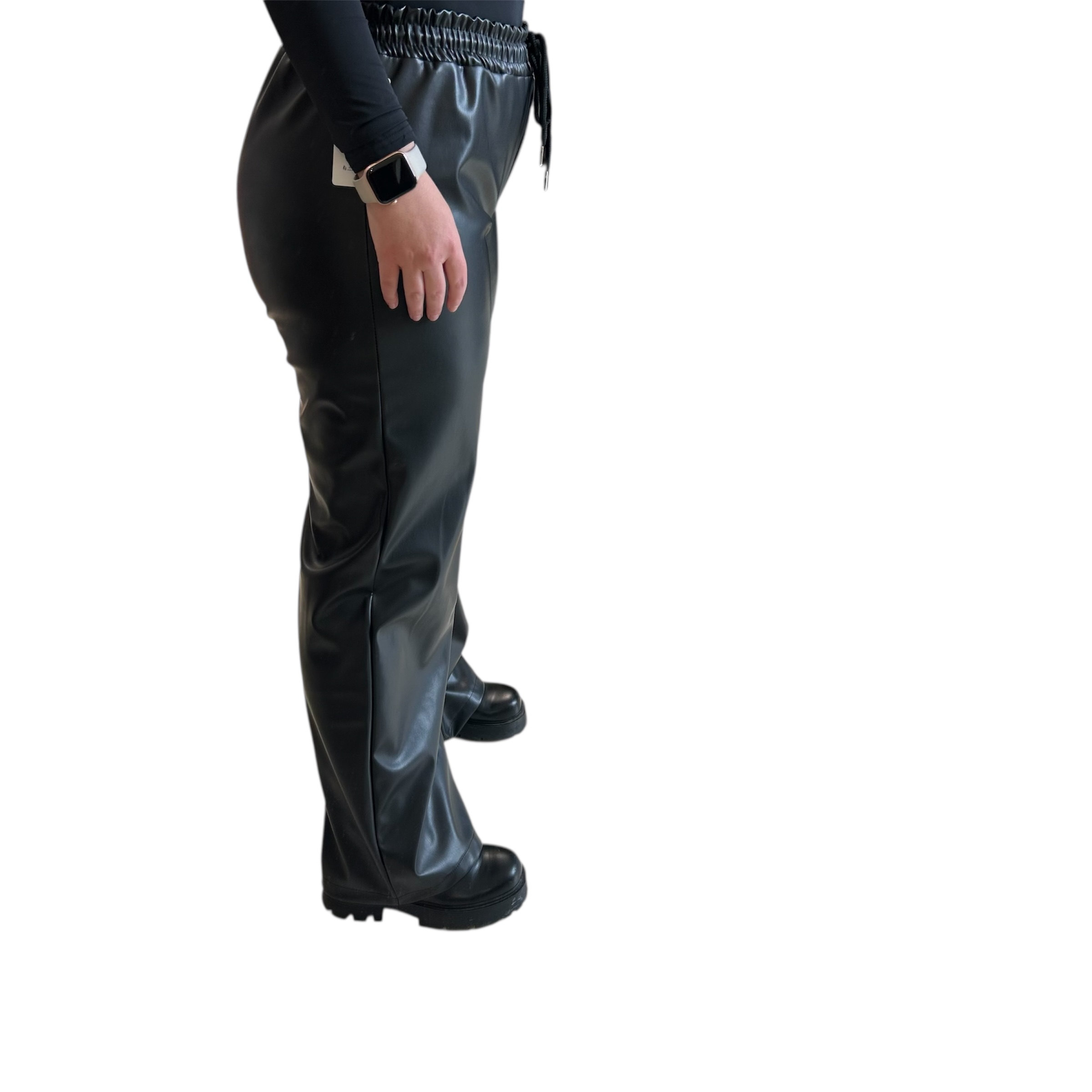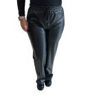 Παντελόνι μαύρο δερματίνη με λάστιχο στη μέση και κορδόνι που αυξομειώνεται, One size. Διαστάσεις: Μέση:70 εκ. έως 100 εκ. Περιφέρεια: έως 120 εκ.Ύψος:1.10 εκ. Σύνθεση: 92% polyester, 8% elastan