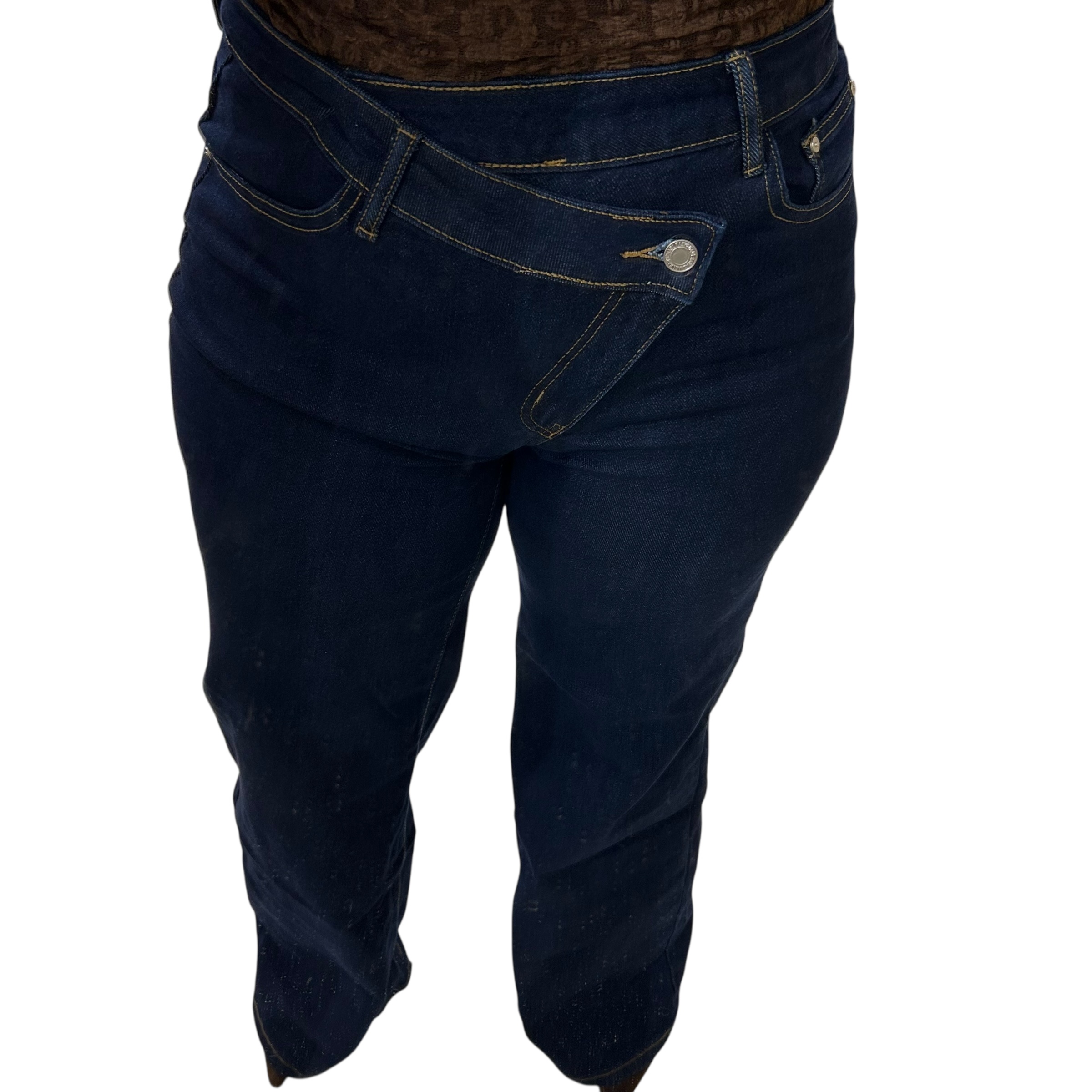 Ψηλόμεσο denim παντελόνι σε φαρδιά γραμμή σε σκούρο μπλε χρώμα. Κλείνει με κουμπί στα πλαϊνά και φερμουάρ στη μέση για άνετη εφαρμογή. Ιδανικό για εντυπωσιακές εμφανίσεις που συνδυάζουν casual και chic αισθητική. Διαθέτει αρκετή ελαστικότητα αυτό το jean για άνεση. Μπορείς να το φορέσεις με ενα απλό T-shirt ή με ένα κορμάκι για εντυπωσιακή βραδινή εμφάνιση ή με ένα πουκάμισο. Σύνθεση:70% cotton,28% polyester, 2% elastan Xsmall: 34, Small: 36, Medium: 38, Large: 40, Xlarge:42 size