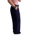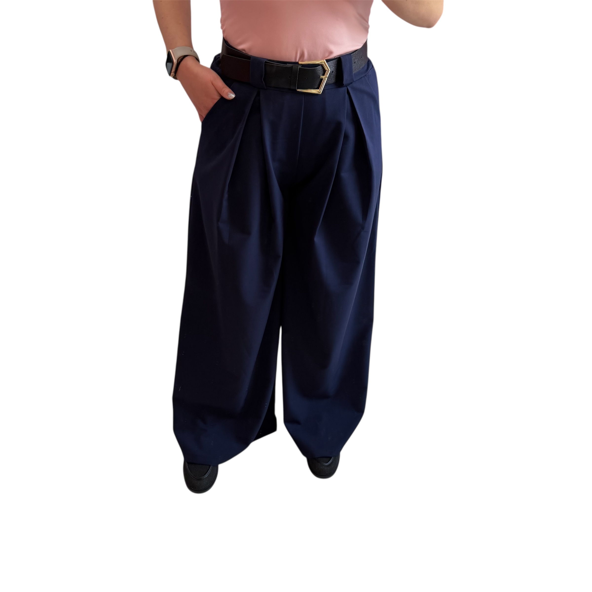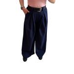 One size παντελόνα μπλε σκούρο με λάστιχο στο πίσω μέρος της. Διαθέτει δική της ζώνη μαύρη με χρυσή αγκράφα και τσέπες πλαινές. Μέση:70 εκ έως 90 εκ., Περιφέρεια: έως 120 εκ., Ύψος: 110εκ. Σύνθεση: 50% viscose, 47% polyester, 3% elastan