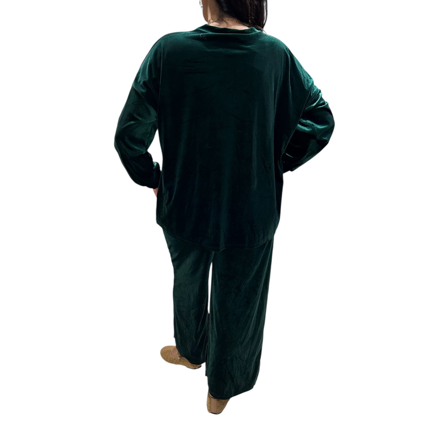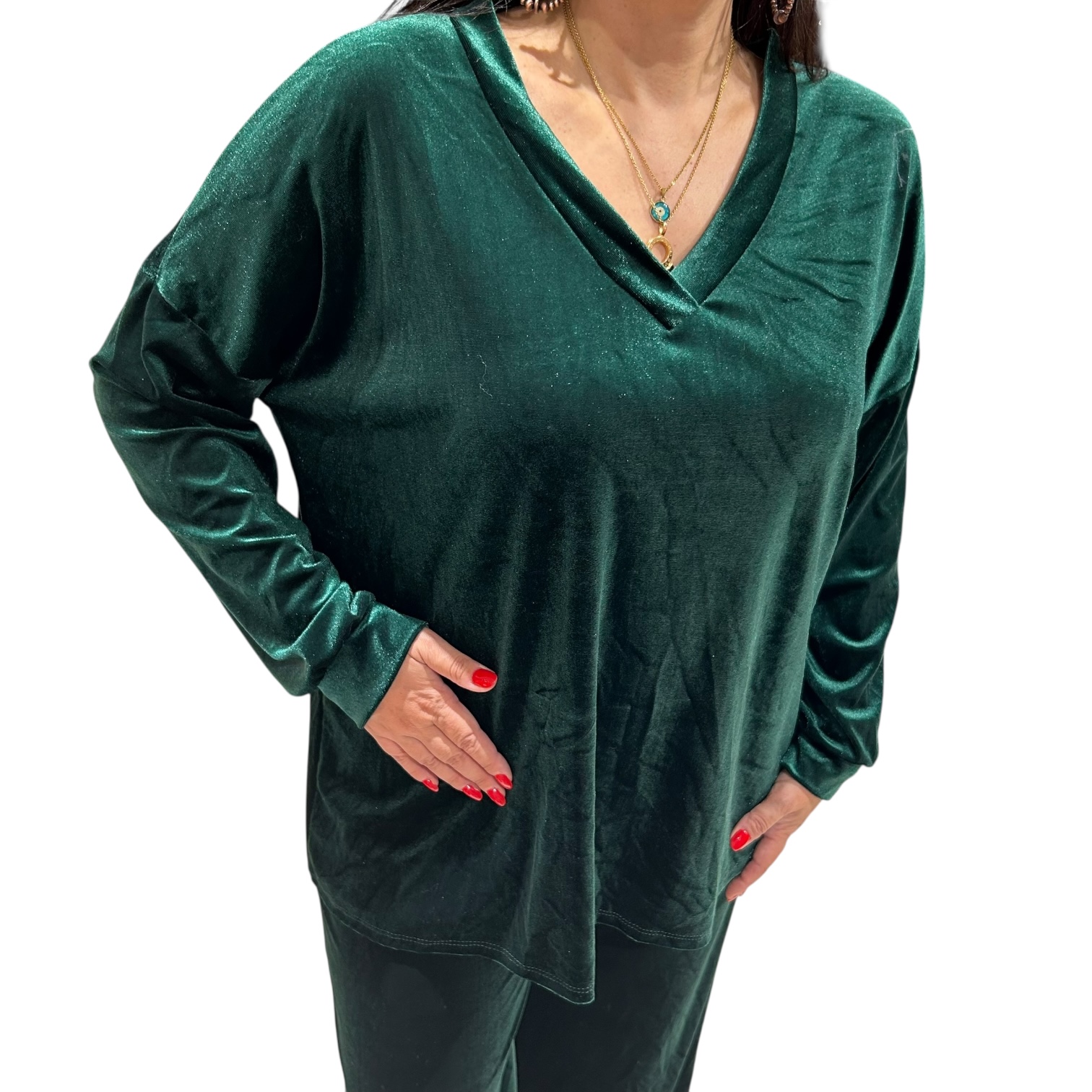 Σετ φόρμας βελουτέ για άνετες καθημερινές εμφανίσεις. Το παντελόνι διαθέτει περιμετρικά στην μέση λάστιχο. Διαστάσεις: Στήθος: 140 εκ., Μέση:120 εκ., Περιφέρεια: 130 εκ. Ύψος παντελονιού: 1.00 μ. Σύνθεση: 95% polyester, 5% elastan