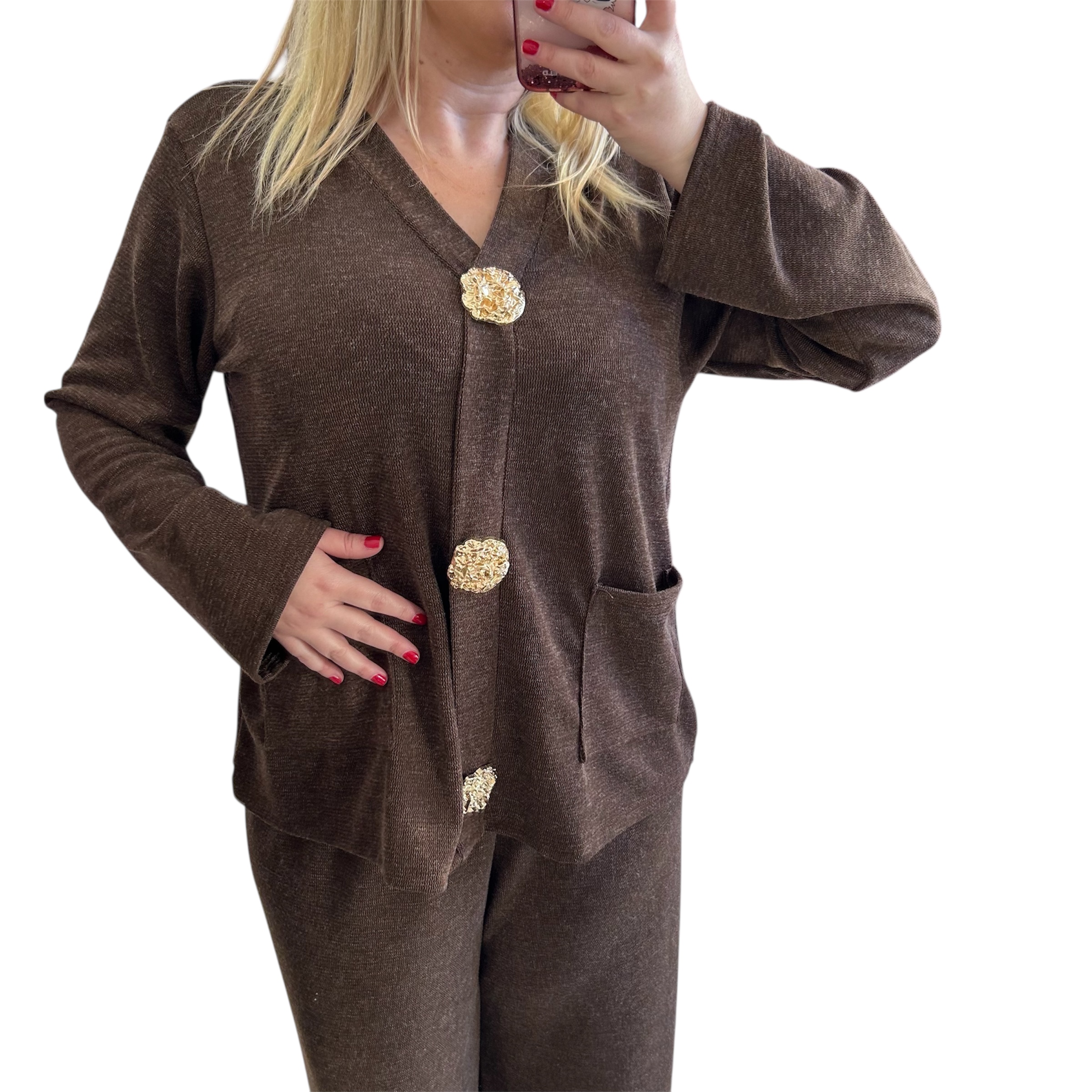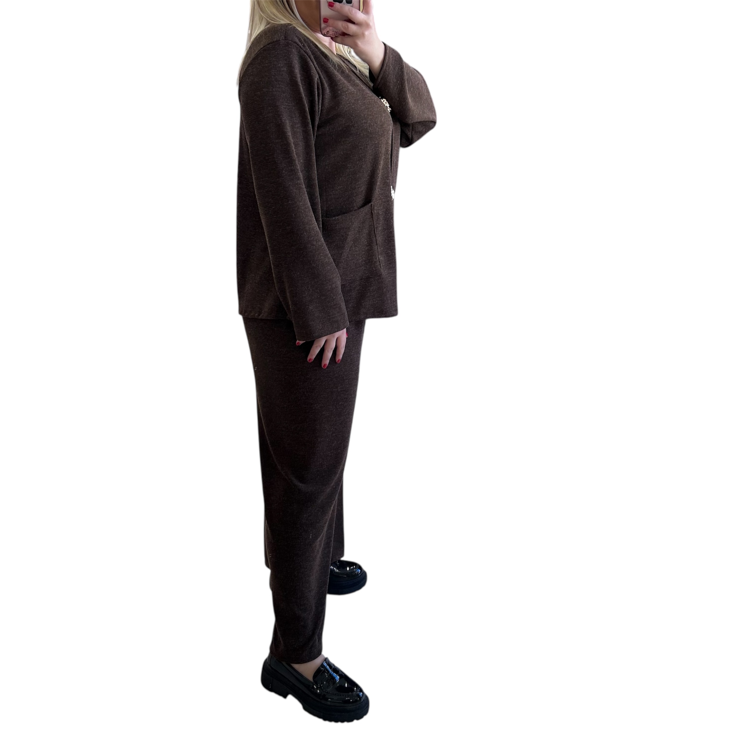 Σετ καφέ παντελόνι με μπλούζα με βε και διακοσμητικές αποσπώμενες καρφίτσες σε χρυσή απόχρωση. Η μπλούζα διαθέτει τσέπες μπροστά. Το παντελόνι διαθέτει λάστιχο στη μέση για άνεση.Ένα εντυπωσιακό σετ και ταυτόχρονα άνετο για γιορτινές και καθημερινές εμφανίσεις. Διαστάσεις: Στήθος: 120 εκ.(διαθέτει ελαστικότητα και μπορεί να καλύψει περισσότερο), Μέση:έως 130 εκ. Περιφέρεια:έως 130 εκ.,Ύψος: 1 μέτρο. Σύνθεση: 50% viscose, 50% acrylic.