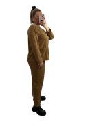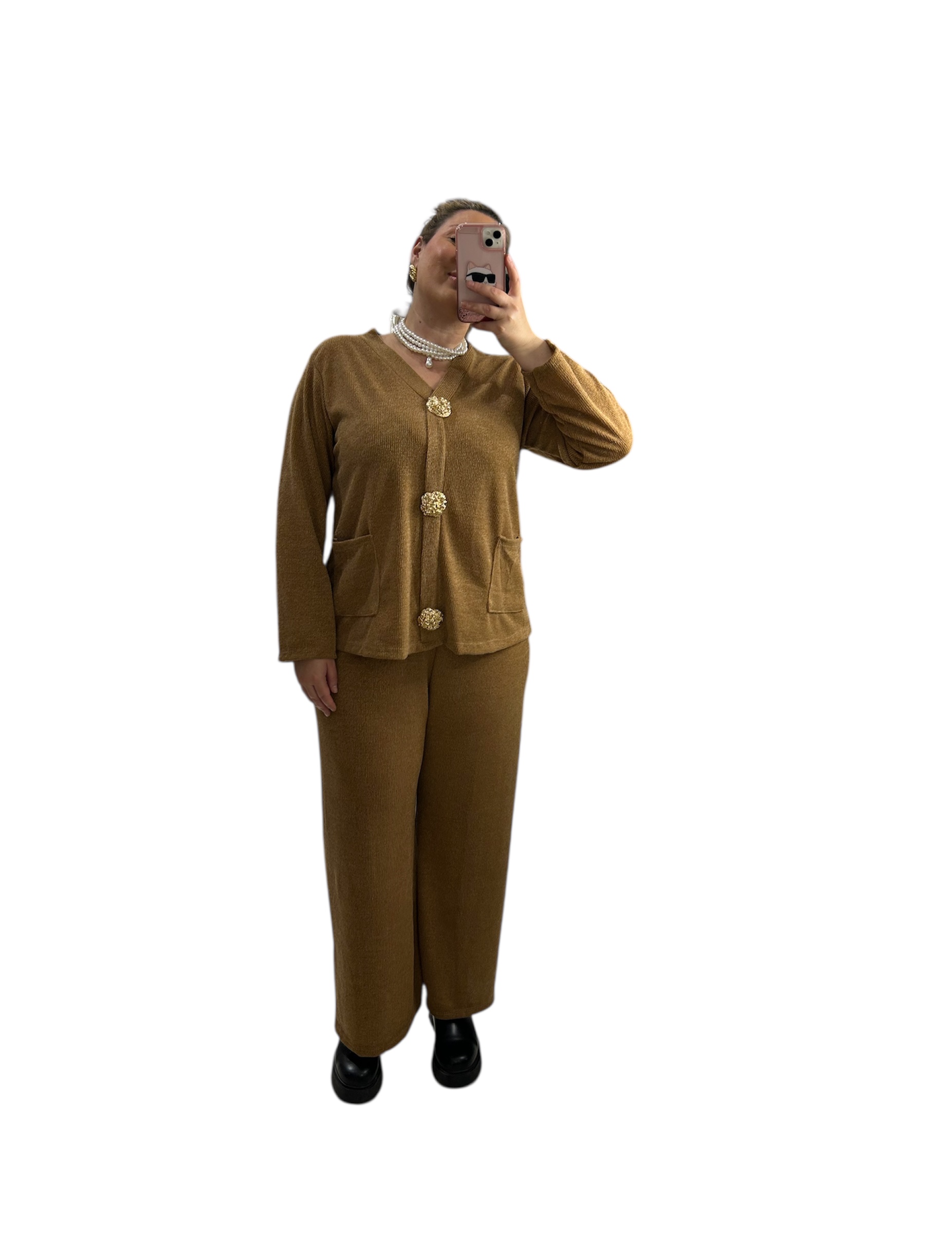 Σετ μπεζ παντελόνι με μπλούζα με βε και διακοσμητικές αποσπώμενες καρφίτσες σε χρυσή απόχρωση. Η μπλούζα διαθέτει τσέπες μπροστά. Το παντελόνι διαθέτει λάστιχο στη μέση για άνεση.Ένα εντυπωσιακό σετ και ταυτόχρονα άνετο για γιορτινές και καθημερινές εμφανίσεις. Διαστάσεις: Στήθος: 120 εκ.(διαθέτει ελαστικότητα και μπορεί να καλύψει περισσότερο), Μέση:έως 130 εκ. Περιφέρεια:έως 130 εκ., Σύνθεση: 50% viscose, 50% acrylic.