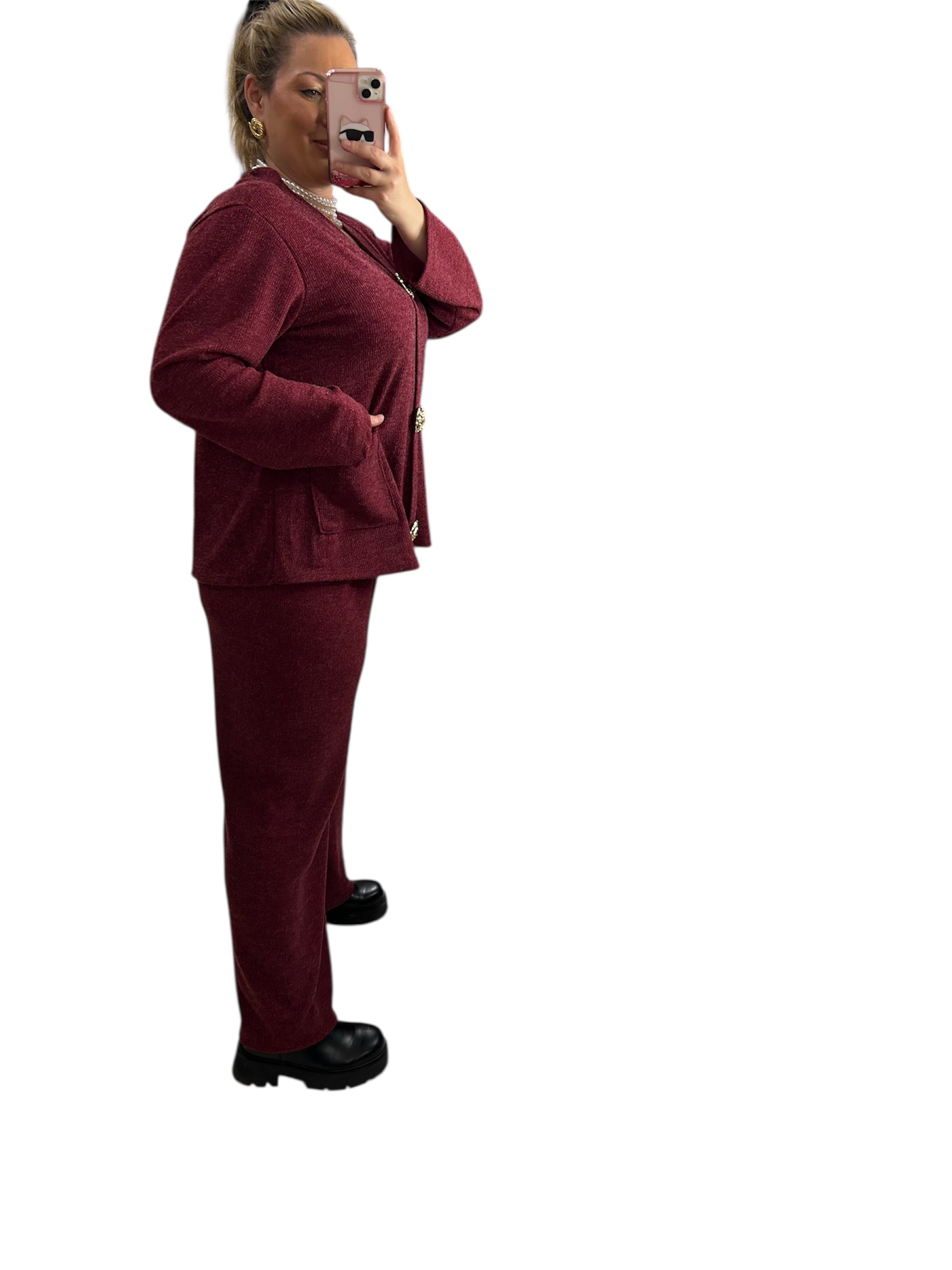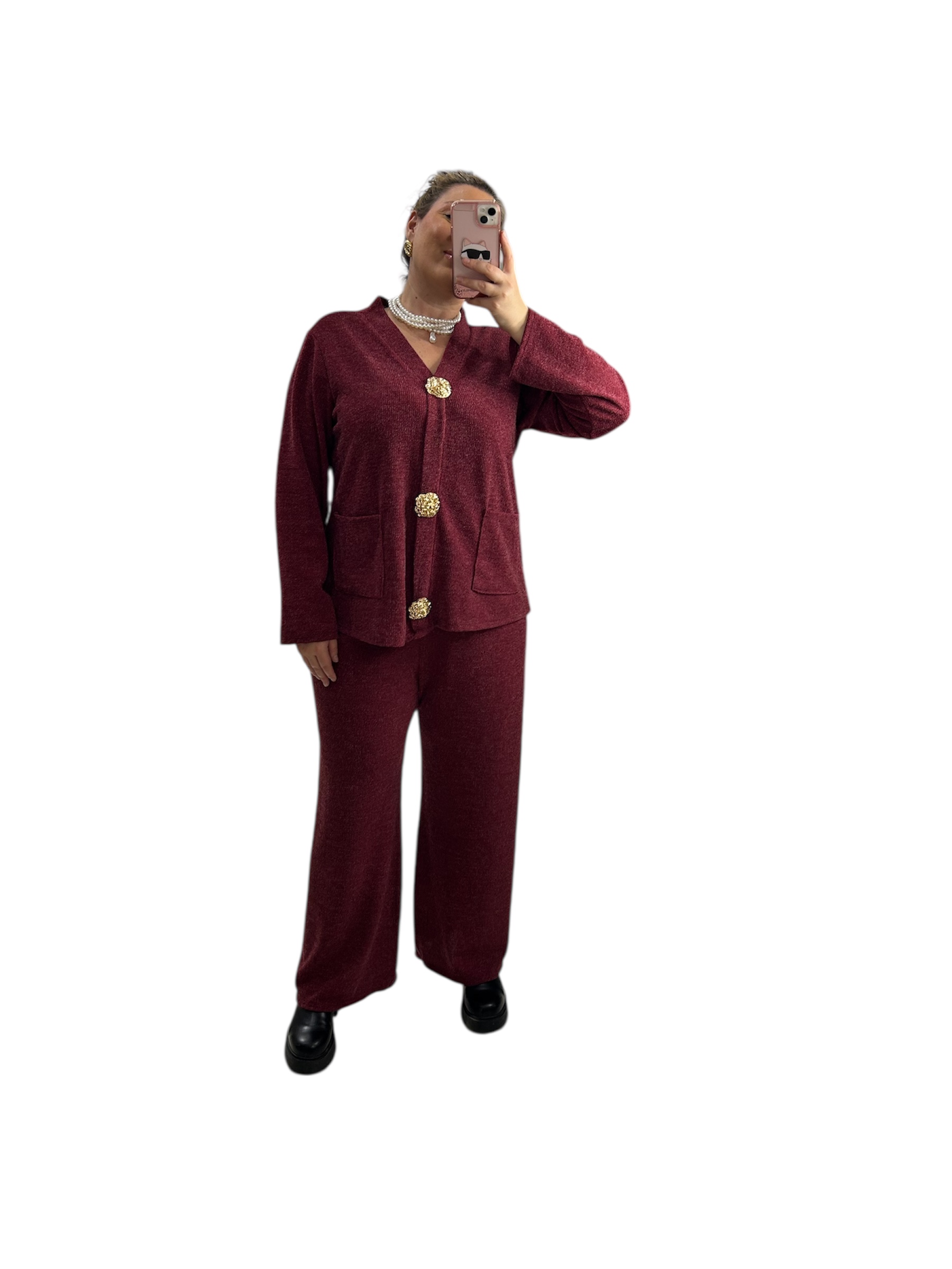 Σετ μπορντό παντελόνι με μπλούζα με βε και διακοσμητικές αποσπώμενες καρφίτσες σε χρυσή απόχρωση. Η μπλούζα διαθέτει τσέπες μπροστά. Το παντελόνι διαθέτει λάστιχο στη μέση για άνεση.Ένα εντυπωσιακό σετ και ταυτόχρονα άνετο για γιορτινές και καθημερινές εμφανίσεις. Διαστάσεις: Στήθος: 120 εκ.(διαθέτει ελαστικότητα και μπορεί να καλύψει περισσότερο), Μέση:έως 130 εκ. Περιφέρεια:έως 130 εκ., Σύνθεση: 50% viscose, 50% acrylic.