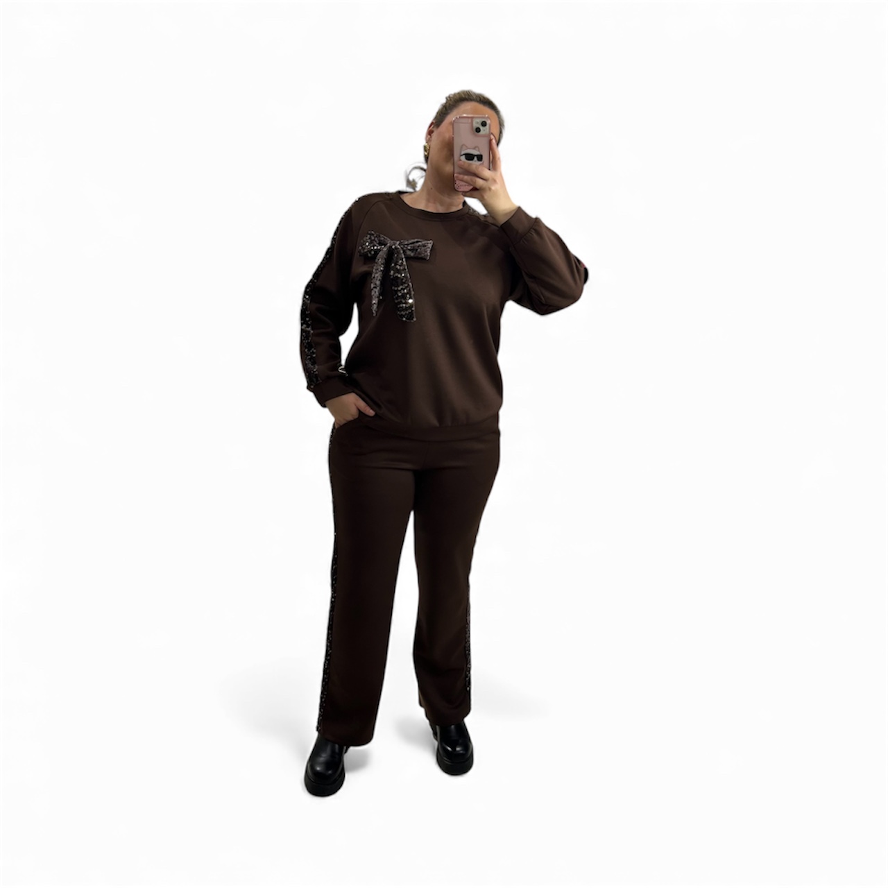 Σετ καφέ παντελόνι με μπλούζα και ιδιαιτερότητα στα πλαινά της μπλούζας και του παντελονιού με τρέσα από βελούδο και πούλιες. Το παντελόνι διαθέτει λάστιχο και κορδόνι καθώς και τσέπες. Η μπλούζα έχει έναν εντυπωσιακό φιόγκο από βελούδο με πουλιες για εντυπωσιακές και ταυτόχρονα άνετες, γιορτινές και μη εμφανίσεις. Διαστάσεις: Στήθος: 120 εκ., Μέση:έως 100 εκ. Περιφέρεια: 120 εκ., Σύνθεση: 40% viscose, 52% polyester, 8% elastan