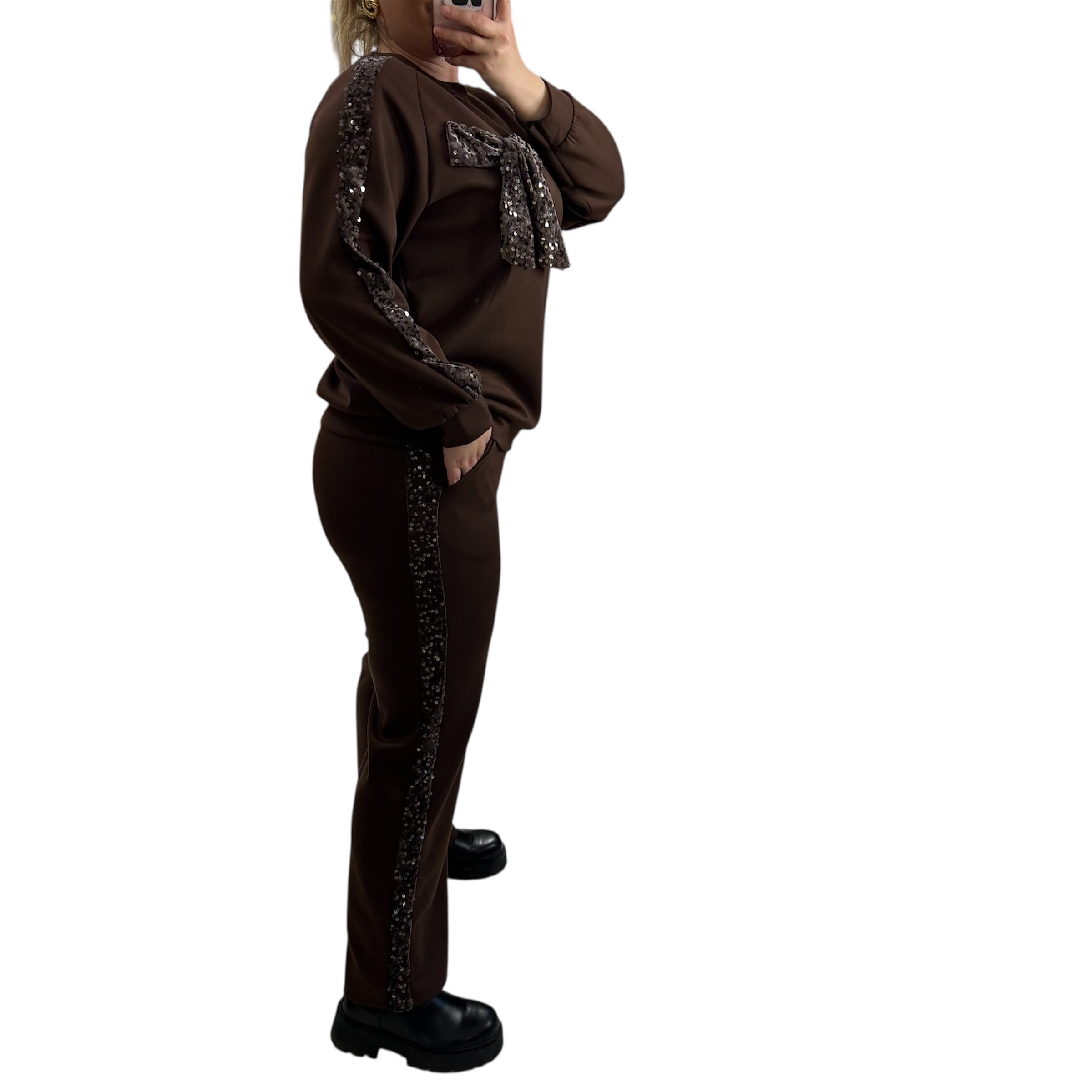 Σετ παντελόνι με μπλούζα καφέ με βελούδινο φιόγκο και πούλιες