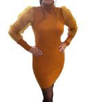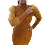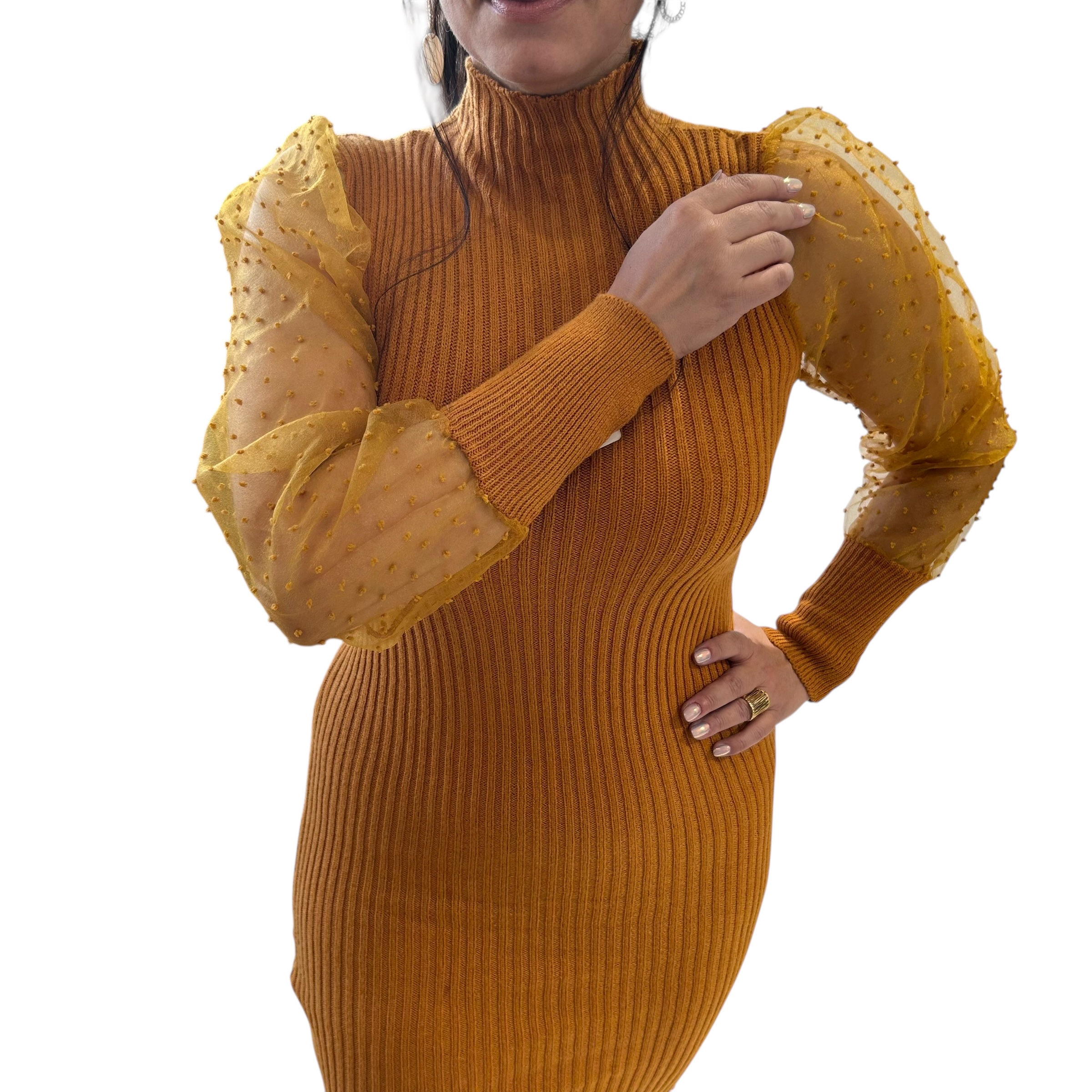One size πλεκτό φόρεμα μουσταρδί με λεπτομέρεια στο μανίκι από τούλι με σχέδιο πουά.