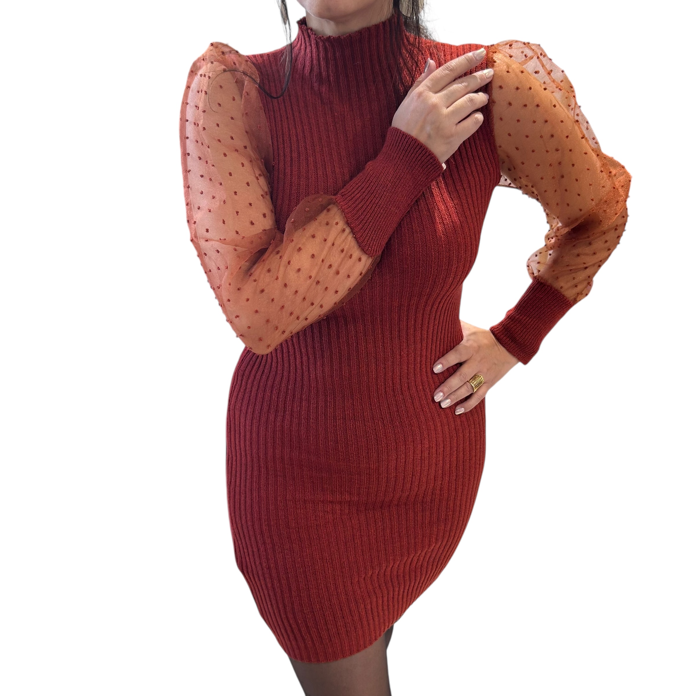 One size πλεκτό φόρεμα μπορντό με λεπτομέρεια στο μανίκι από τούλι με σχέδιο πουά.