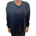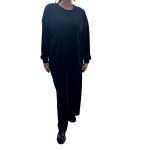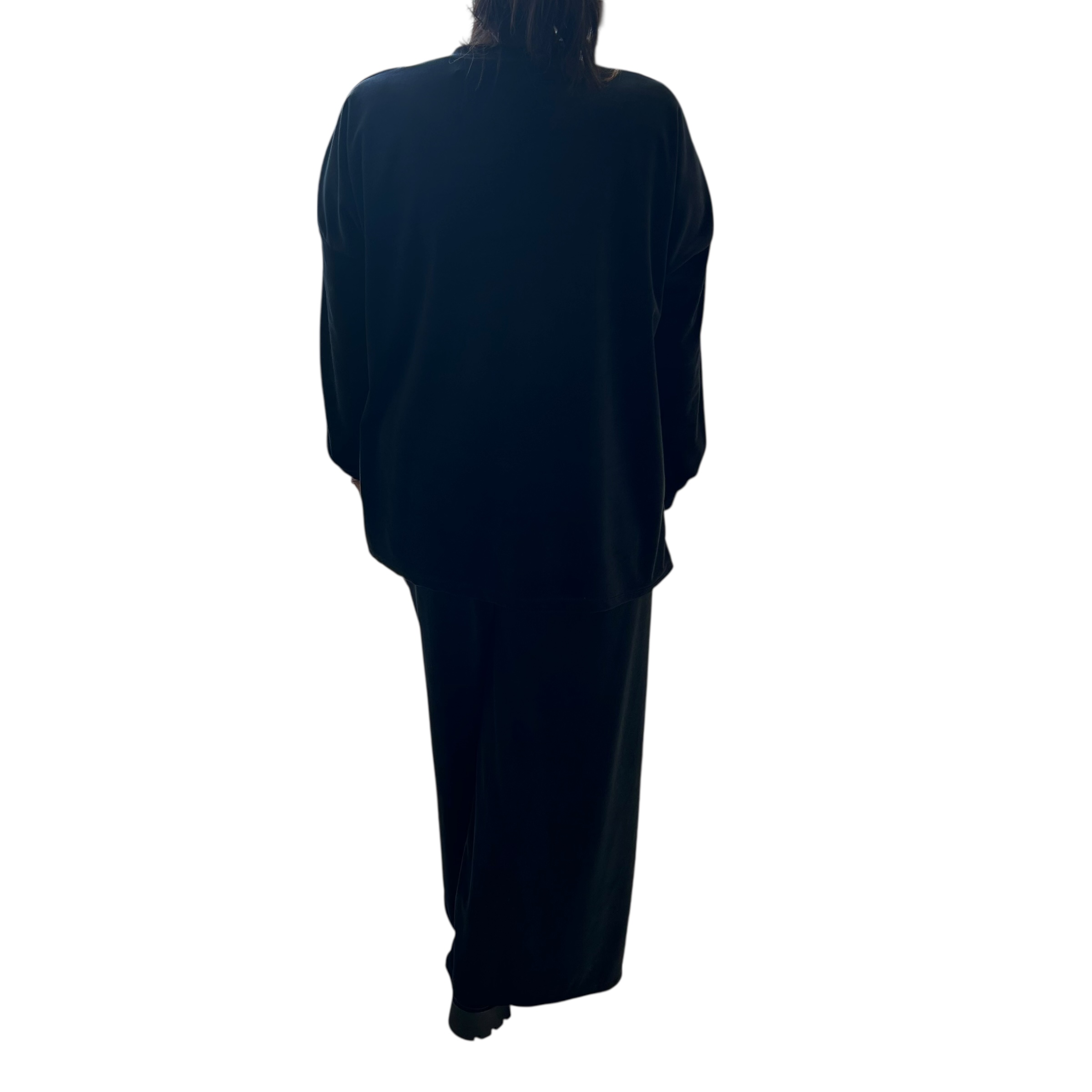 One size βελουτέ φόρμα σε μαύρη απόχρωση. Το παντελόνι είναι ψηλόμεσο και διαθέτει λάστιχο στη μέση. Διαστάσεις: Στήθος: 134εκ., Μέση:120 εκ. Ύψος παντελονιού: 102 εκ. Σύνθεση: 60% viscose, 35% polyester, 5% elastan