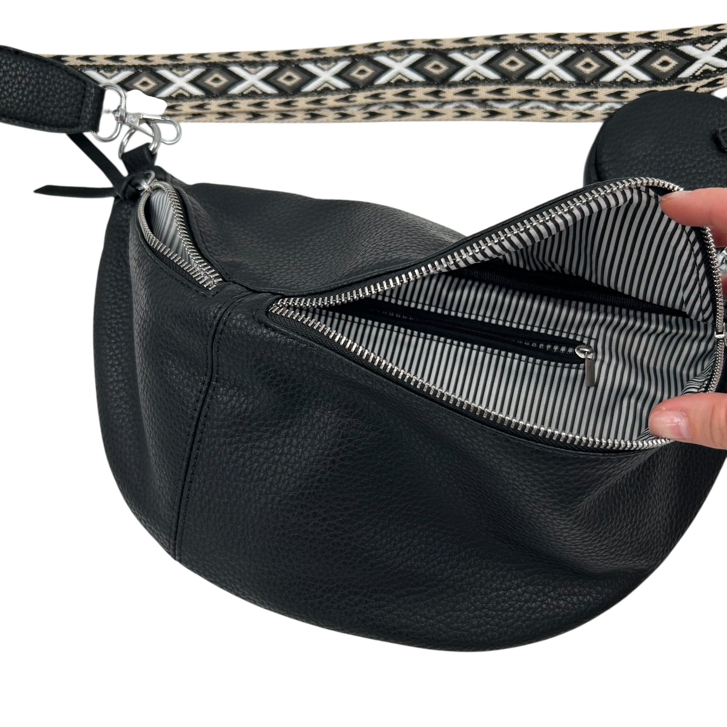 Τσάντα χιαστί σε μαύρη απόχρωση. Διαθέτει εξωτερικά διπλό φερμουάρ και εσωτερικά μια θήκη με φερμουάρ. Στην πίσω όψη διαθέτει θήκη με φερμουάρ. Διαστάσεις προϊόντος: 35Μ*15Υ*12Β